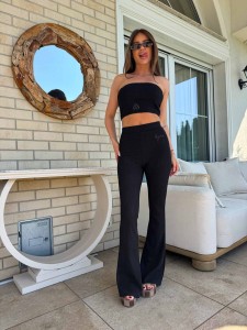 Stylowy komplet składający się z dwóch elementów – topu oraz spodni. Top w formie opaski, bez ramiączek, wykonany z elastycznego, dopasowującego się do ciała materiału, doskonale podkreśla górne partie sylwetki. Spodnie z wysokim stanem i gumką w pasie, pięknie wydłużają nogi i akcentują talię. Całość zapewnia komfort noszenia i efekt wysmuklenia sylwetki.