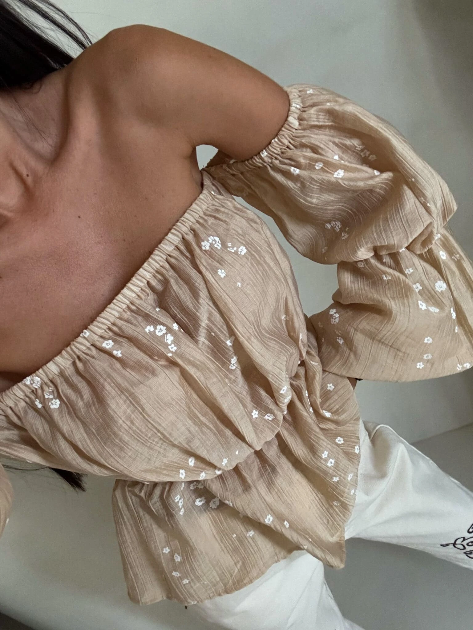 Bluzka hiszpanka MISS print kwiatuszki beżowe