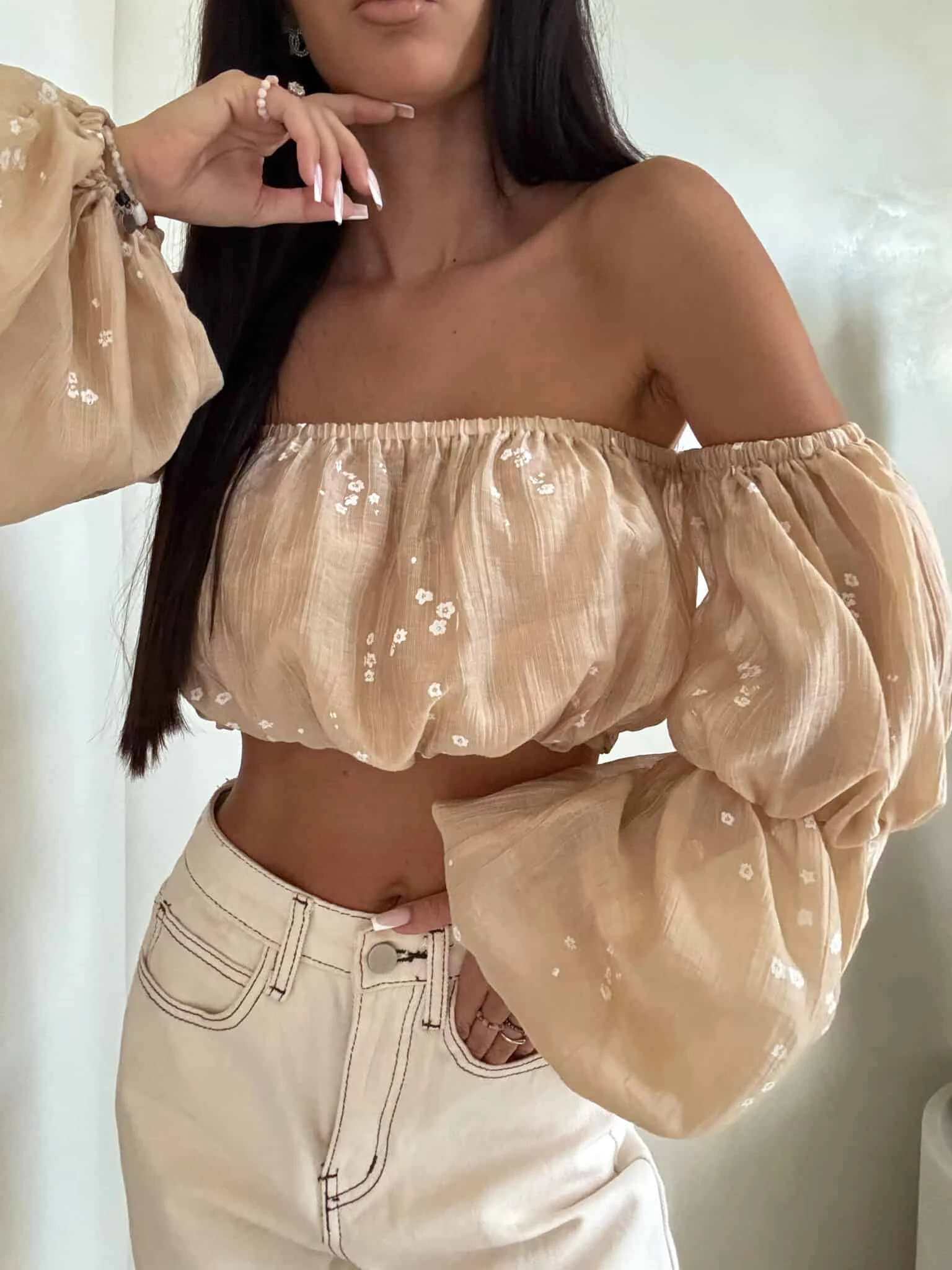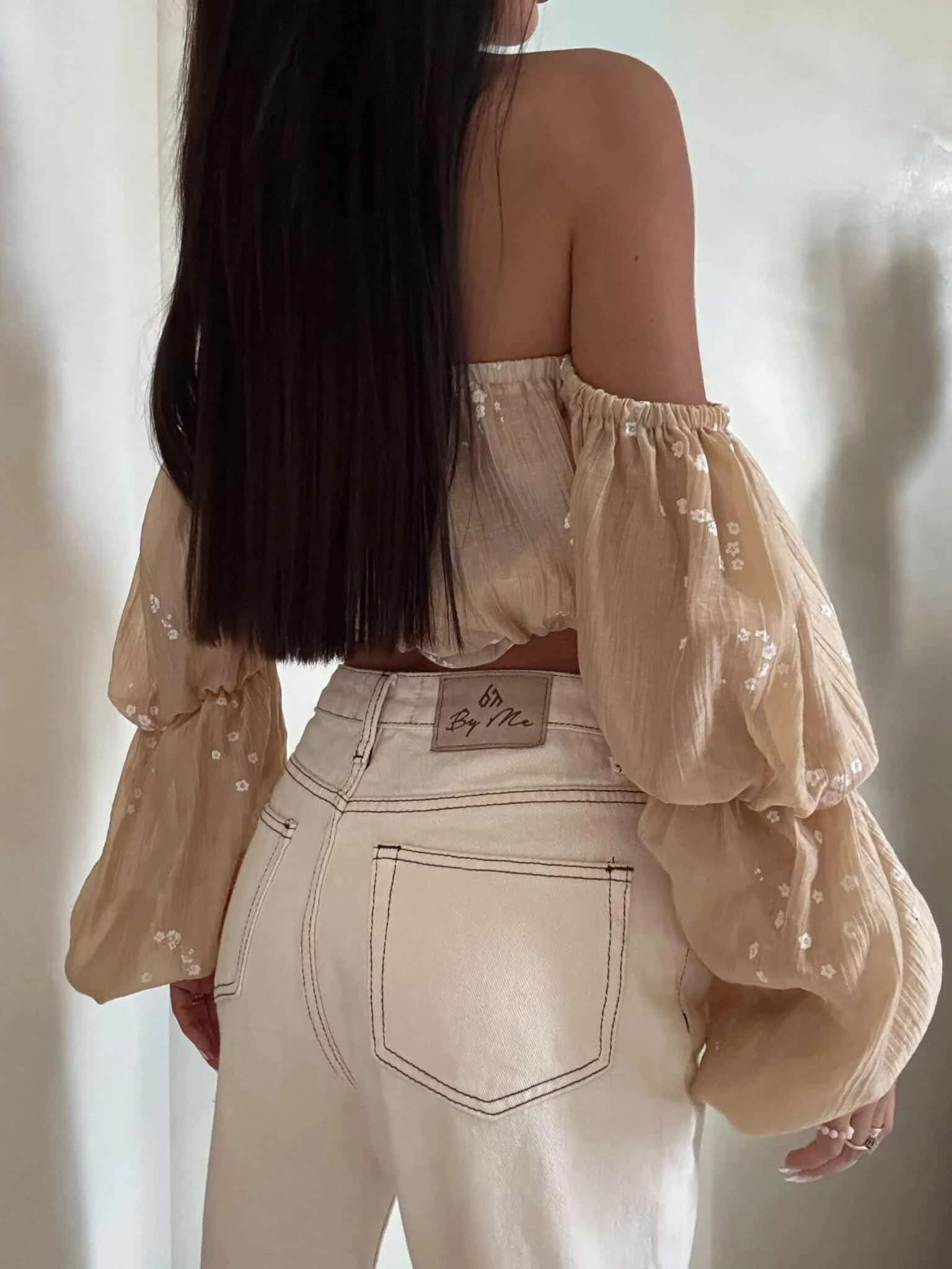 Bluzka typu hiszpanka – z odkrytymi ramionami i elastycznym wykończeniem przy dekolcie. Rękawy są długie, lekko bufiaste, zakończone gumeczką.