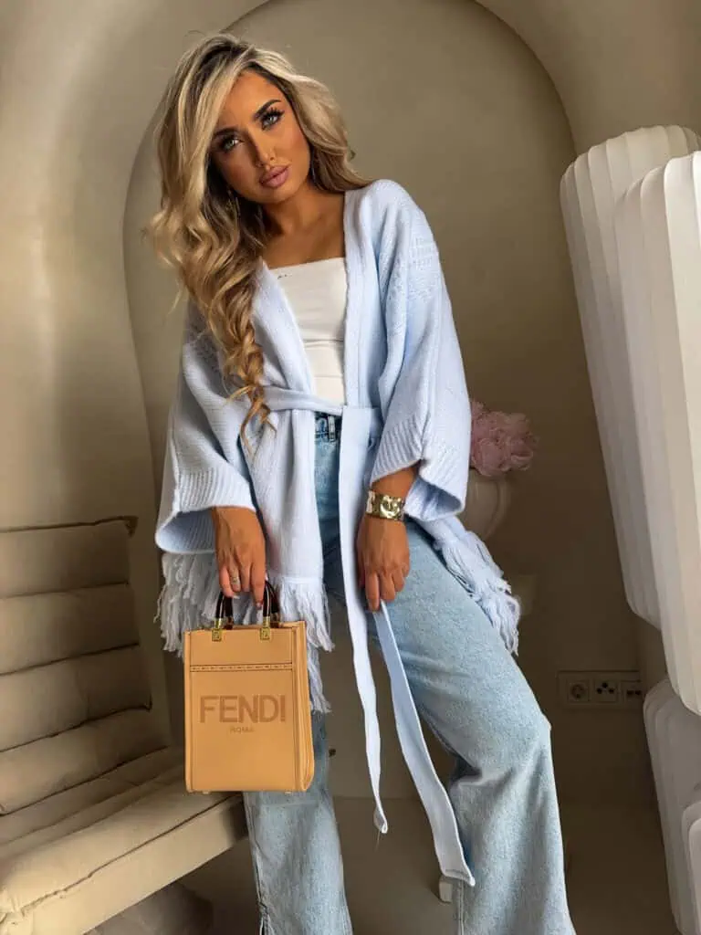 Podkreśl swój styl z kardiganem Oriana. Kardigan ma luźny, otwarty fason, a talię można podkreślić dołączonym paskiem, dzięki czemu sylwetka nabiera kobiecego kształtu. Dół kardiganu ozdobiony frędzlami, które nadają mu lekkości i boho charakteru.