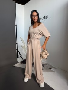 Kombinezon o nowoczesnej, minimalistycznej formie, zaprojektowany jako efekt wszytego t-shirtu połączonego z luźnymi spodniami. Tworzy spójny, effortless look bez potrzeby stylizacji. Luźny top z krótkim rękawem i dekoltem V łączy się z szerokimi, swobodnie układającymi się nogawkami. Elastyczna talia delikatnie podkreśla sylwetkę, zapewniając jednocześnie komfort noszenia. Model wykonany z miękkiego, lejącego materiału premium z subtelnymi detalami brandingowymi. Idealny na co dzień, podróże i letnie stylizacje jako gotowy, kompletny outfit.