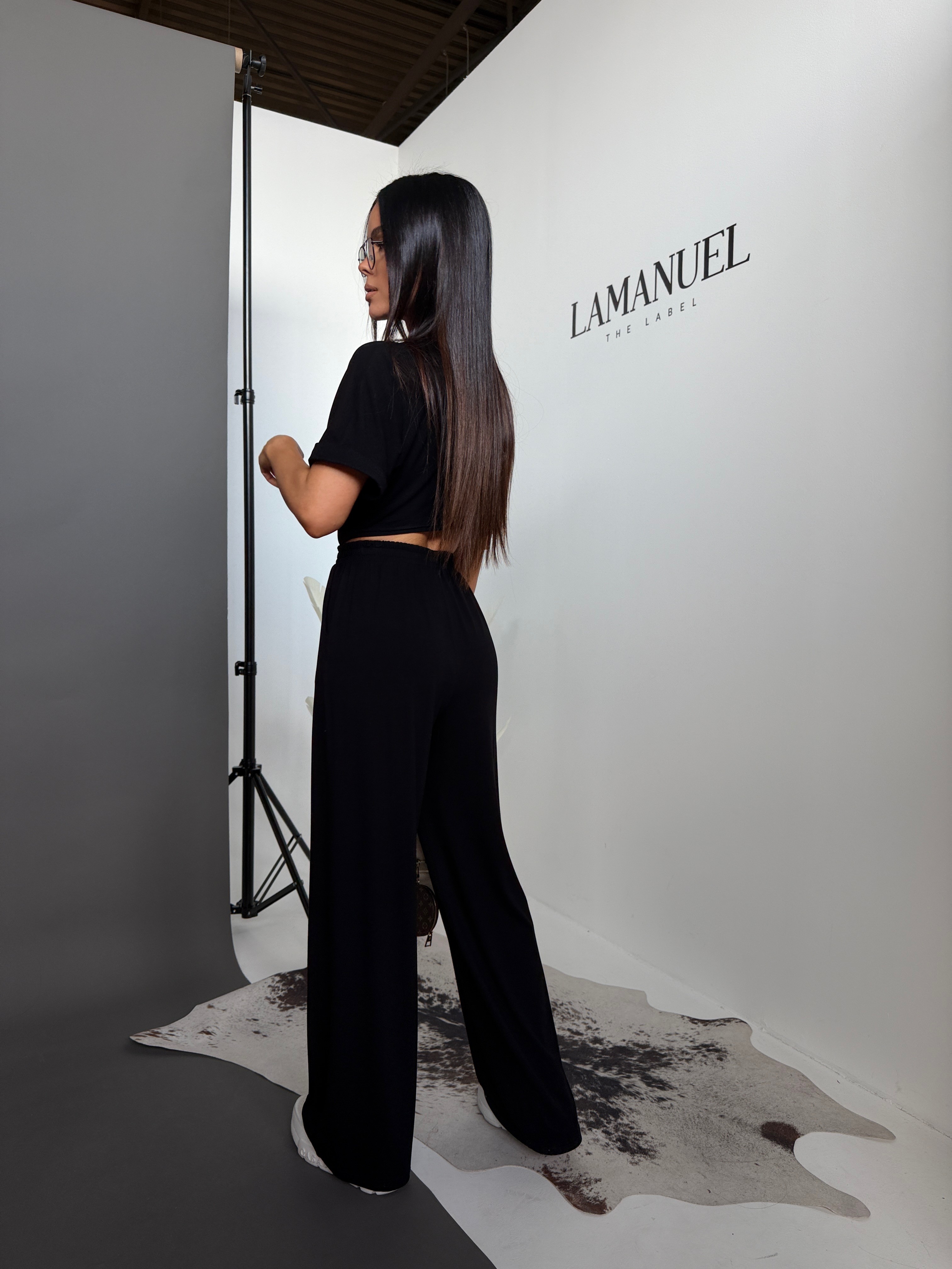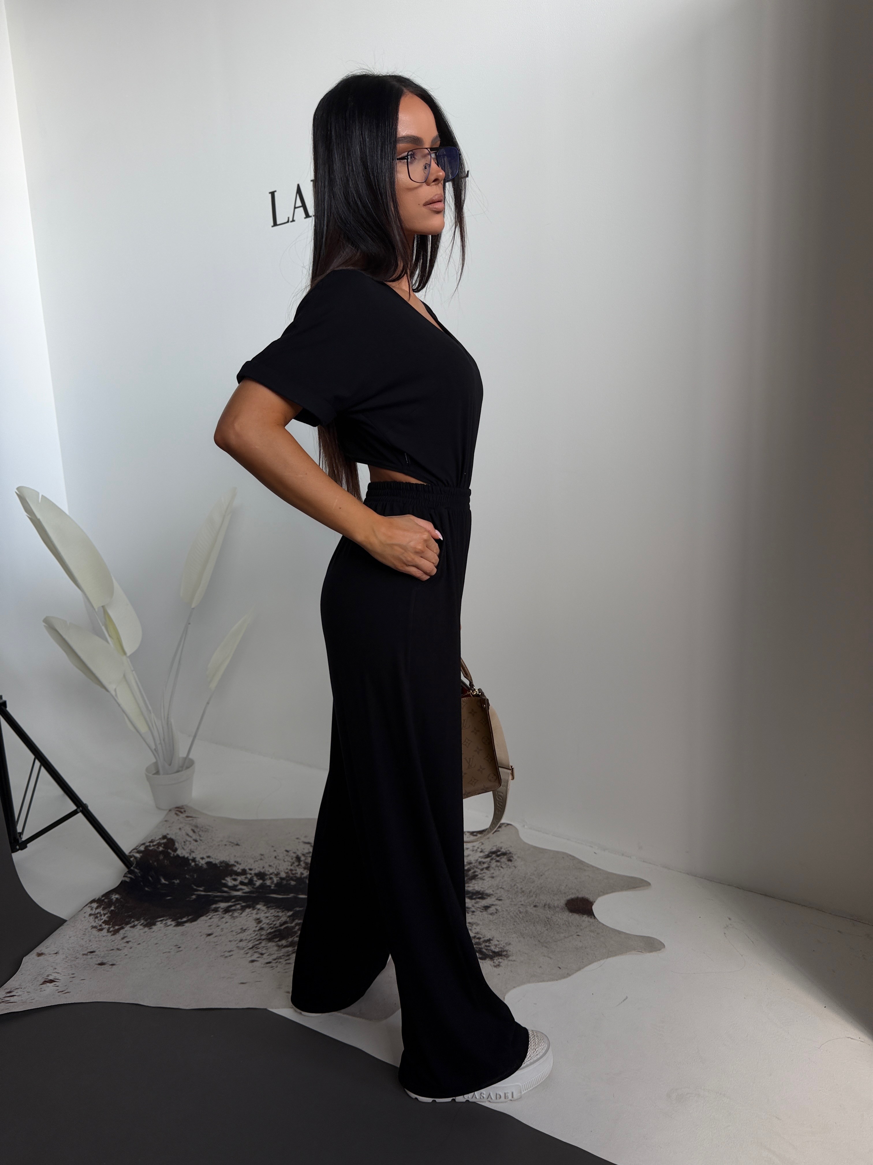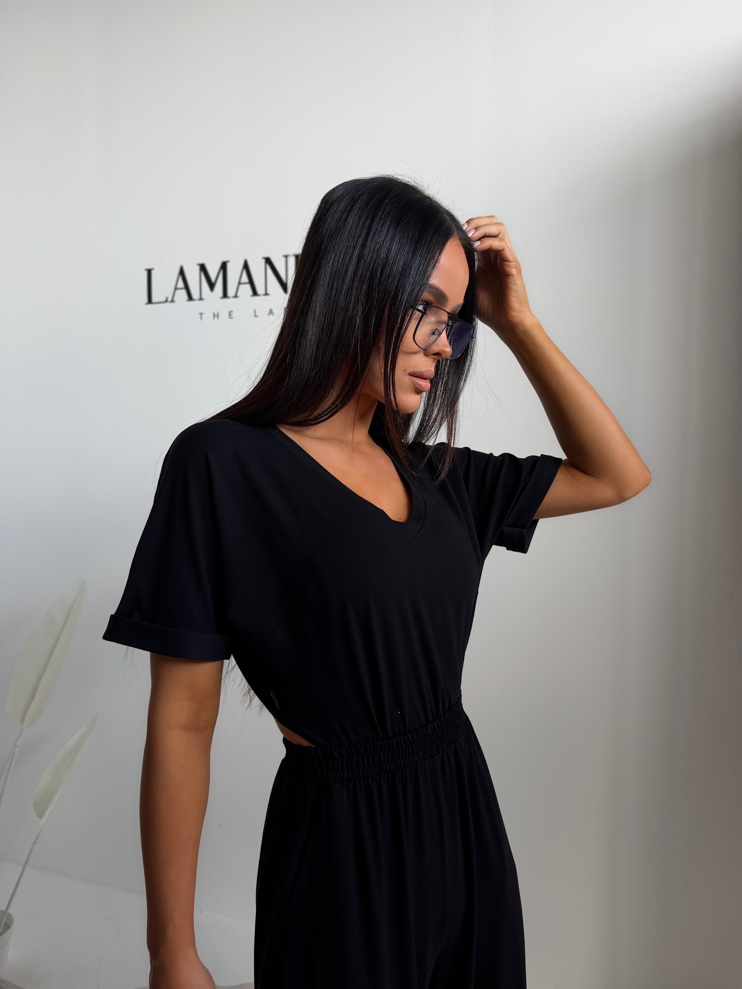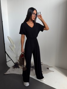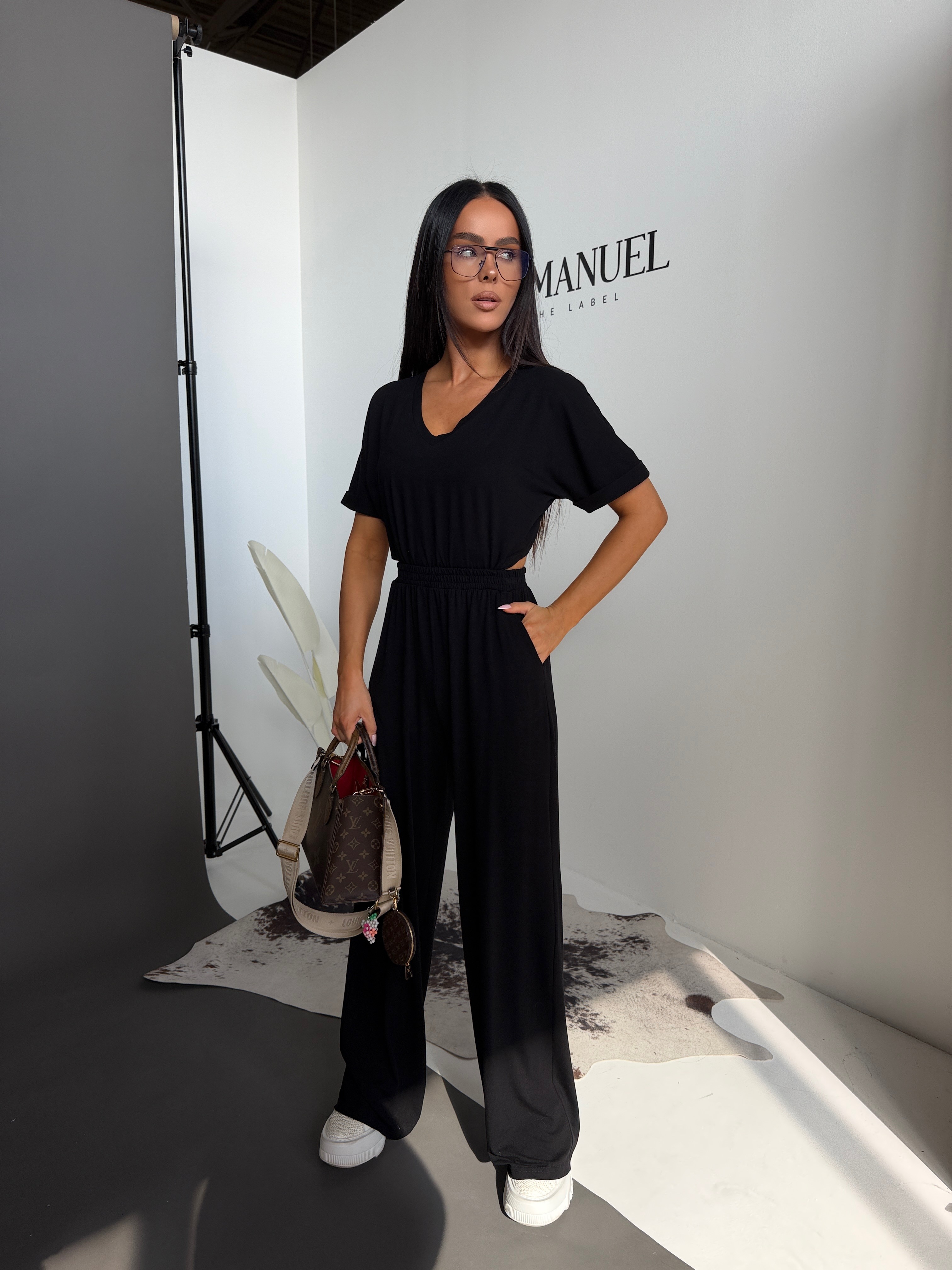 Kombinezon o nowoczesnej, minimalistycznej formie, zaprojektowany jako efekt wszytego t-shirtu połączonego z luźnymi spodniami. Tworzy spójny, effortless look bez potrzeby stylizacji. Luźny top z krótkim rękawem i dekoltem V łączy się z szerokimi, swobodnie układającymi się nogawkami. Elastyczna talia delikatnie podkreśla sylwetkę, zapewniając jednocześnie komfort noszenia. Model wykonany z miękkiego, lejącego materiału premium z subtelnymi detalami brandingowymi. Idealny na co dzień, podróże i letnie stylizacje jako gotowy, kompletny outfit.