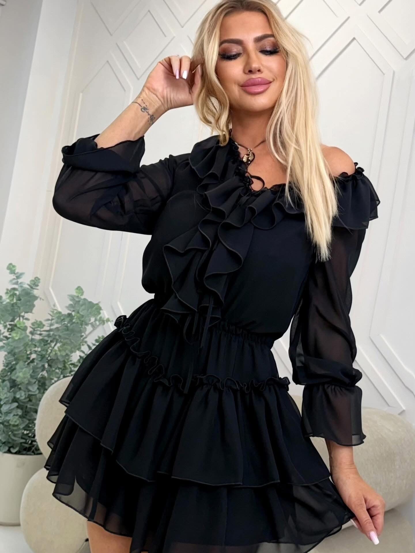 Kombinezon szyfonowy wykonany z lekkiego, zwiewnego materiału, który pięknie układa się na sylwetce. Z przodu efektowny żabot z możliwością regulacji dzięki trzem troczkom do wiązania, pozwalającym dopasować dekolt według własnych preferencji. Rękawy zakończone gumką tworzą subtelny efekt dzwoneczka i dodają całości romantycznego charakteru.
