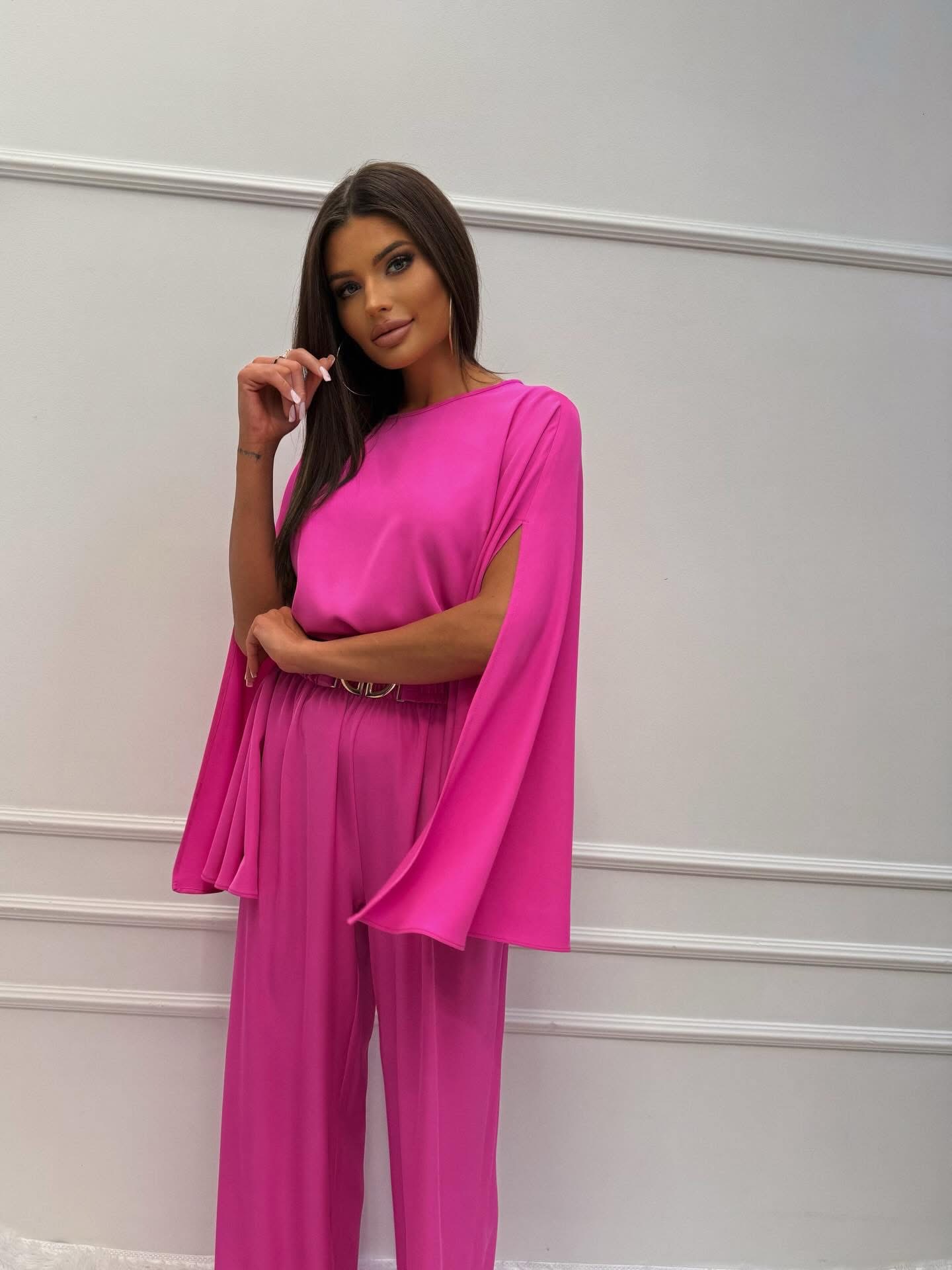 Stylowy i niezwykle kobiecy kombinezon damski w kolorze pudrowego różu to idealna propozycja dla kobiet, które cenią elegancję, wygodę oraz ponadczasowy design. Model „Elegance Flow” zachwyca subtelnym krojem z luźnymi, efektownie opadającymi rękawami oraz szerokimi nogawkami, które pięknie wysmuklają sylwetkę.