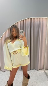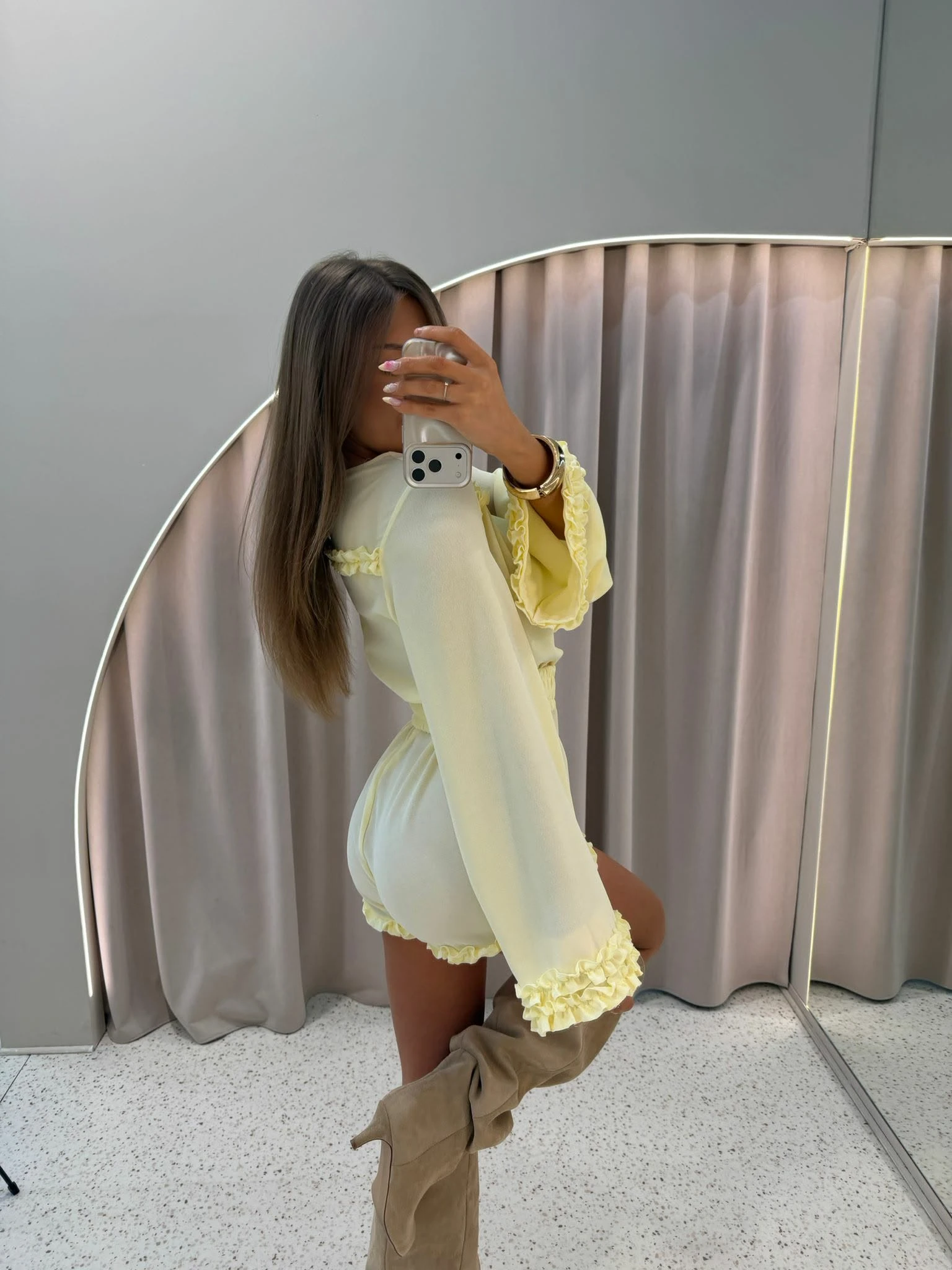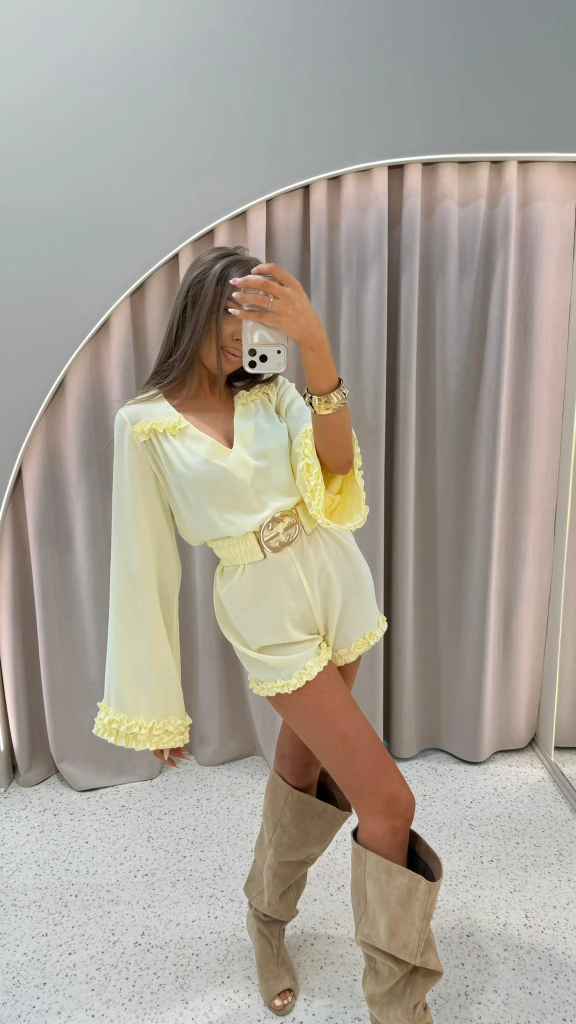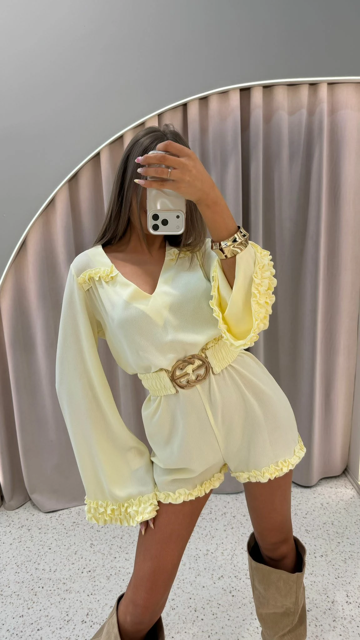 Kombinezon SORELLE z uroczymi falbankami to idealny wybór, jeśli chcesz wyglądać stylowo i kobieco. Pasek pięknie podkreśla talię, a możliwość noszenia go na dwa sposoby daje Ci pełną swobodę stylizacji.