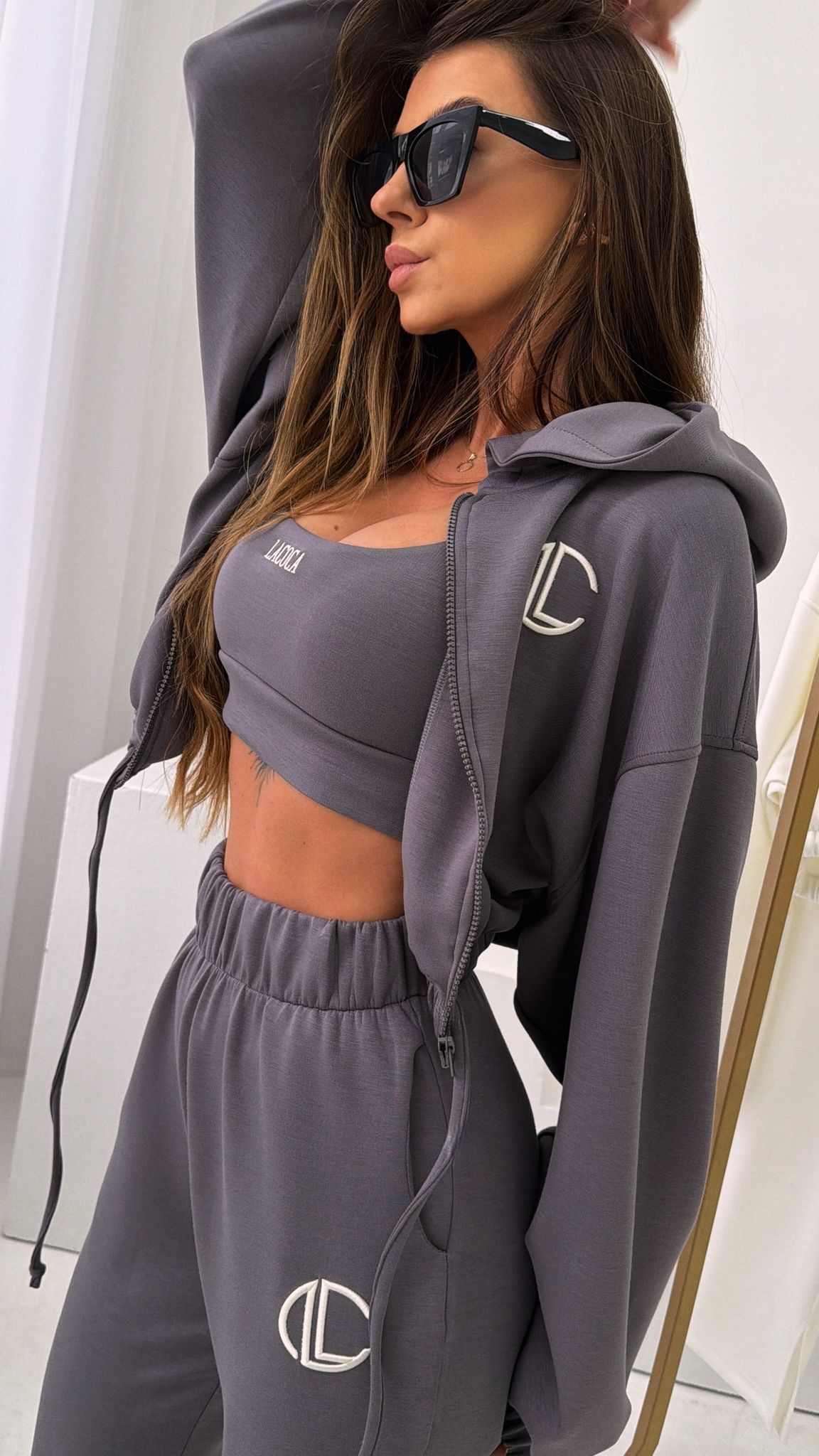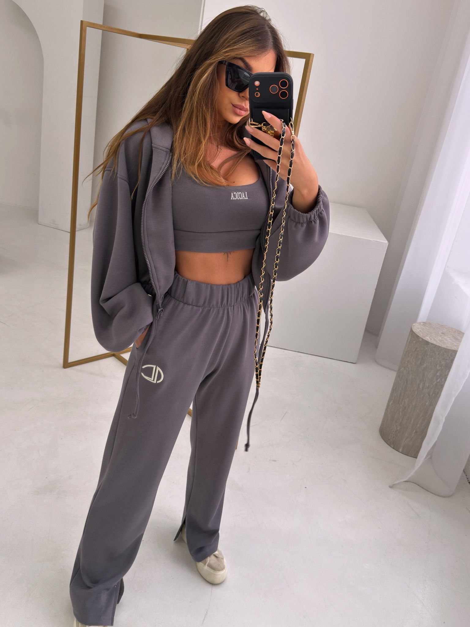 Nowoczesny miejski look w wersji premium. Gotowa stylizacja w jednym komplecie. W zestawie: •szerokie spodnie z modnymi rozporkami •rozpinana bluza z kapturem •top o dopasowanym kroju Detale premium: • logo na spodniach, bluzie i topie • nowoczesny, lejący krój pięknie pracujący w ruchu • miękki materiał typu „masełko” – wyjątkowo przyjemny w dotyku