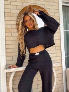Komplet składa się z dwóch części: góra to krótka bluzka (crop top) z długimi, lekko rozszerzanymi rękawami i luźniejszym krojem. Dół stanowią spodnie z wysokim stanem i bardzo szerokimi nogawkami, które wydłużają sylwetkę i dodają elegancji.