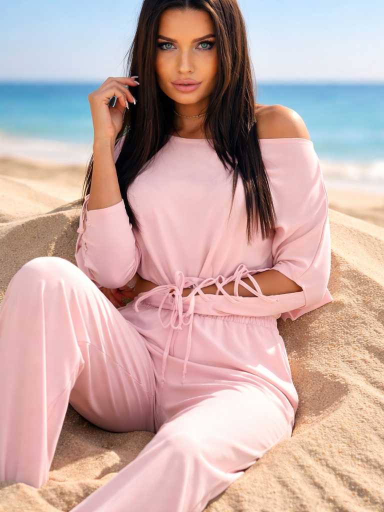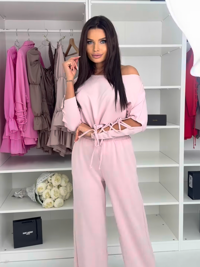 Komplet dresowy z miękkiego, naddającego się materiału typu „masełko” to połączenie komfortu i nowoczesnej elegancji. Bluza o luźnym kroju z dekoltem w łódkę subtelnie podkreśla linię ramion, a efektowne wiązania na rękawach nadają całości wyjątkowego charakteru. Spodnie z wysokim stanem i szeroką gumą w pasie gwarantują wygodę noszenia oraz idealne dopasowanie do sylwetki. Szerokie nogawki zapewniają swobodę ruchów i modny look.