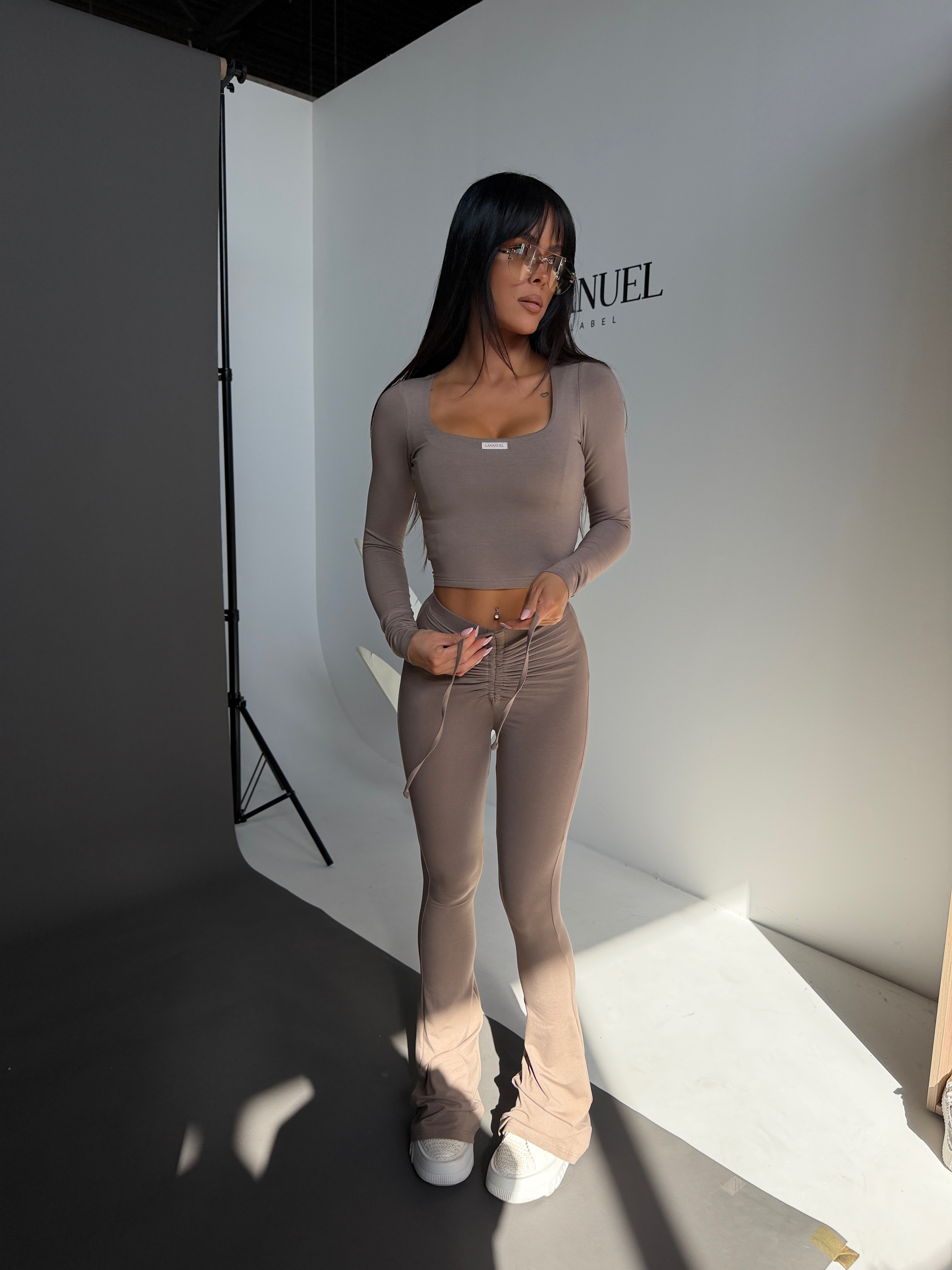 Komplet wykonany z miękkiej, elastycznej wiskozy, która dopasowuje się do sylwetki i podkreśla jej kształt. Składa się z dopasowanej bluzki z długim rękawem i kobiecym, kwadratowym dekoltem oraz legginsów z efektownym marszczeniem i regulacją w pasie. Materiał jest przyjemny w dotyku, lekki i komfortowy w noszeniu, a całość tworzy spójny, nowoczesny zestaw o wyrazistym, kobiecym charakterze.