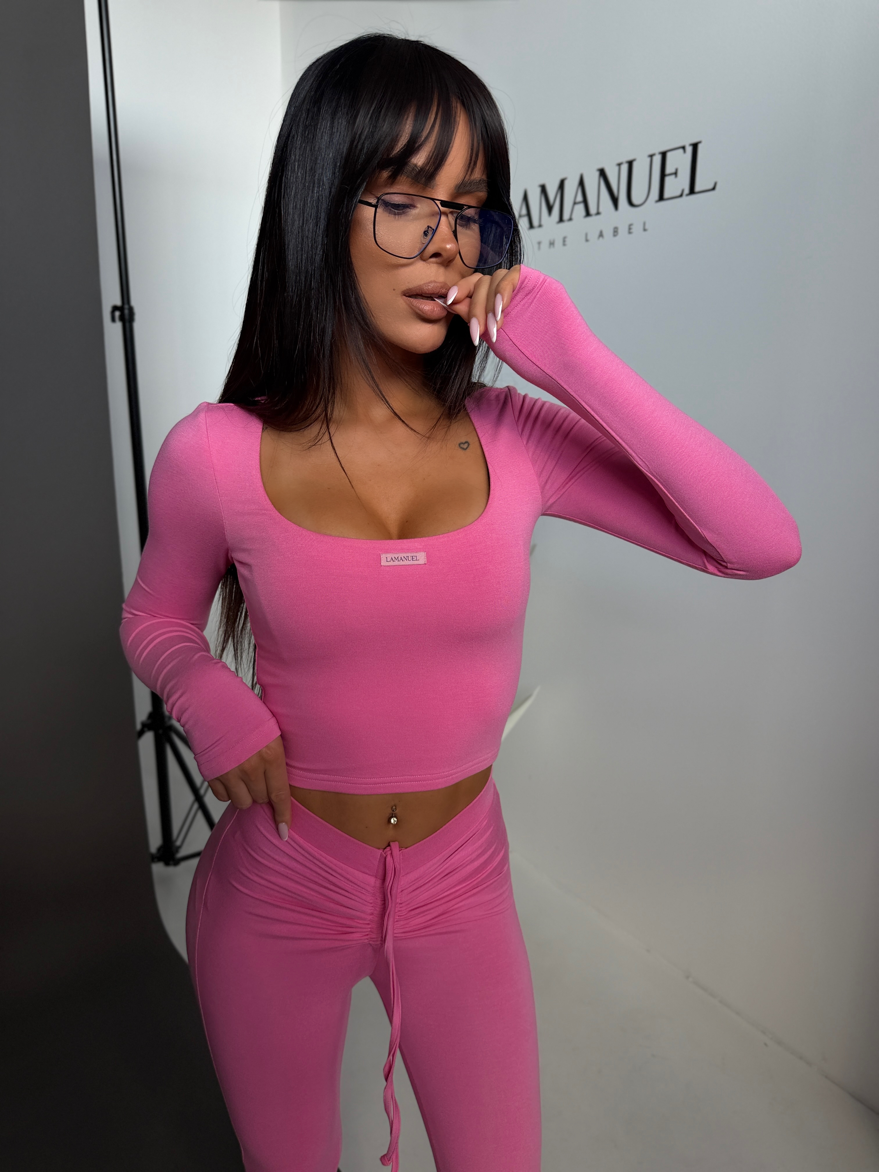 Komplet wykonany z miękkiej, elastycznej wiskozy, która dopasowuje się do sylwetki i podkreśla jej kształt. Składa się z dopasowanej bluzki z długim rękawem i kobiecym, kwadratowym dekoltem oraz legginsów z efektownym marszczeniem i regulacją w pasie. Materiał jest przyjemny w dotyku, lekki i komfortowy w noszeniu, a całość tworzy spójny, nowoczesny zestaw o wyrazistym, kobiecym charakterze.