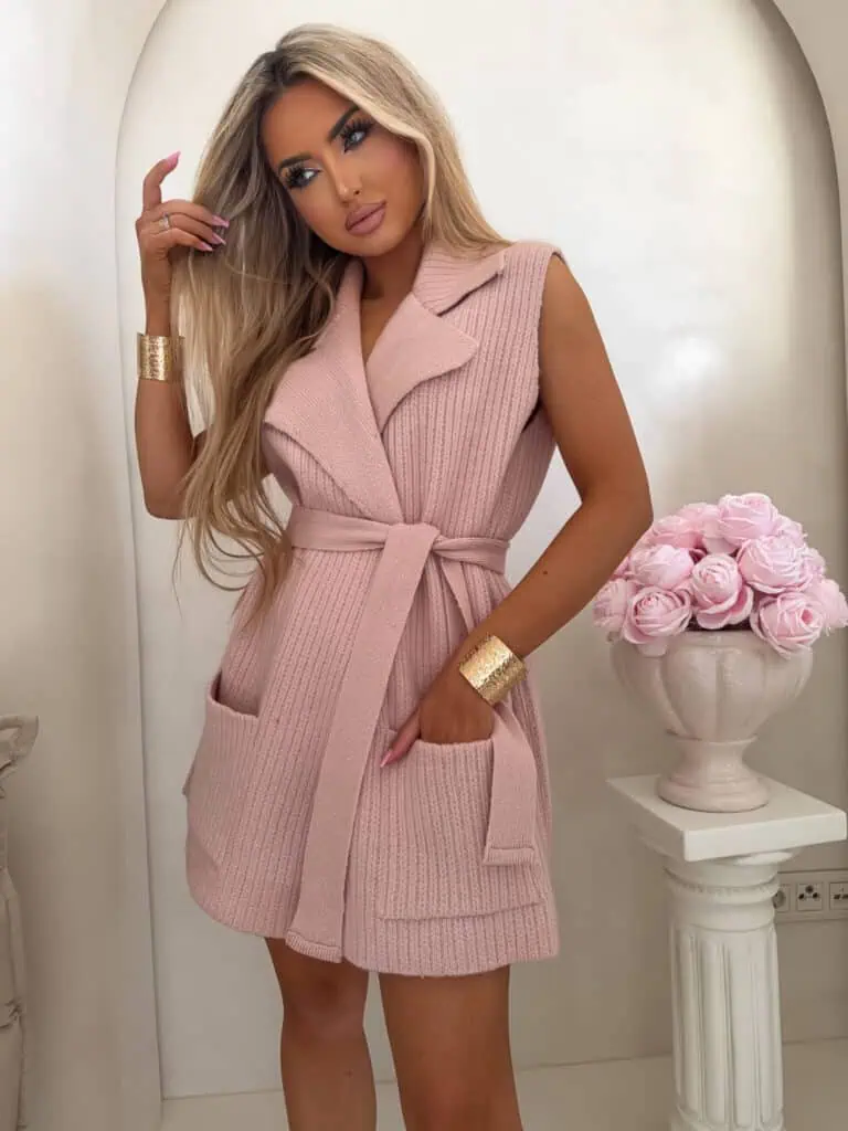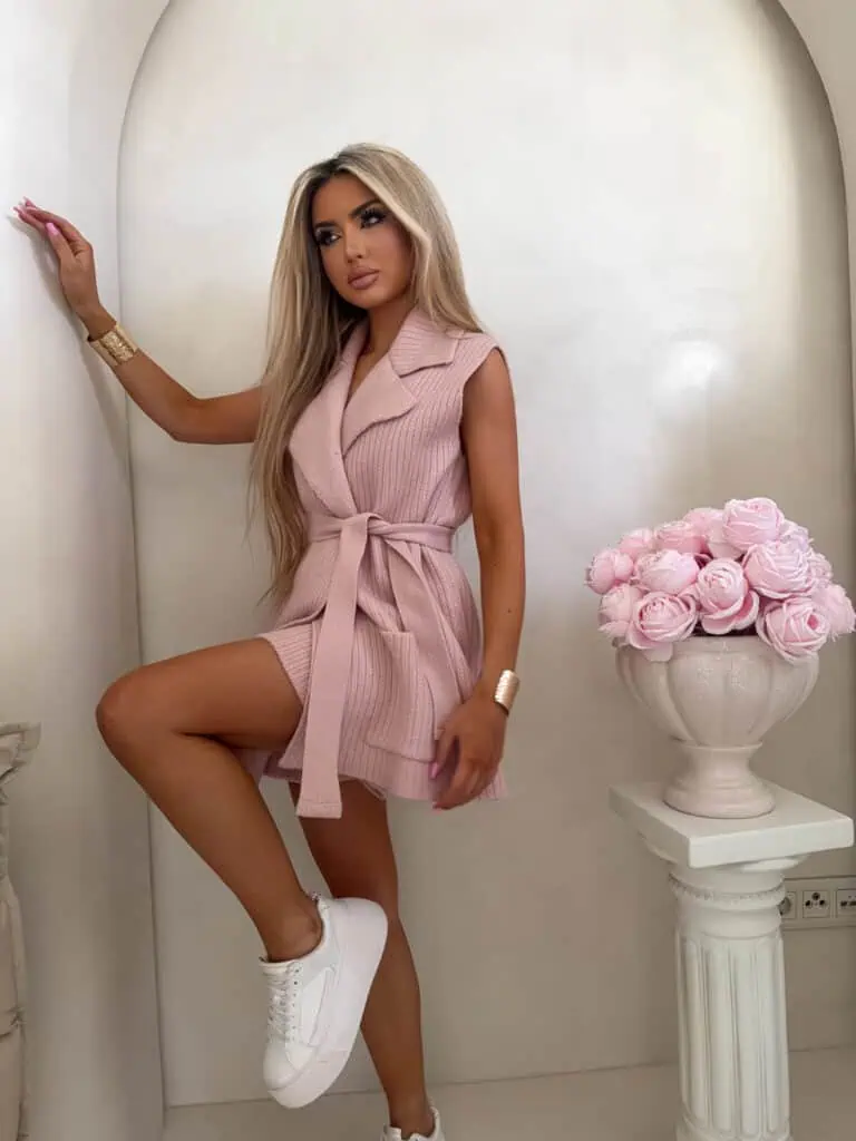 Stylowy komplet składający się z kamizelki o dłuższym kroju oraz krótkich spodenek. Kamizelka posiada dwie praktyczne kieszenie, a kołnierz nadaje całości eleganckiego stylu. W zestawie znajduje się pasek, który pozwala podkreślić talię i dopasować fason do własnych preferencji. Krótkie spodenki z wygodną gumką w pasie gwarantują komfort noszenia oraz idealne dopasowanie do sylwetki.