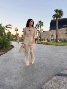 Letni komplet składający się z dwóch części: luźnej bluzki z rękawem do łokcia, wykonana z delikatnej koronki. Charakterystyczne logowanie na środku nadaje mu wyrazistego, streetwearowego charakteru. Luźny krój świetnie układa się na sylwetce. Spodnie z tej samej koronki, lekko rozszerzane ku dołowi. Są półtransparentne, co podkreśla lekkość materiału i letni styl.