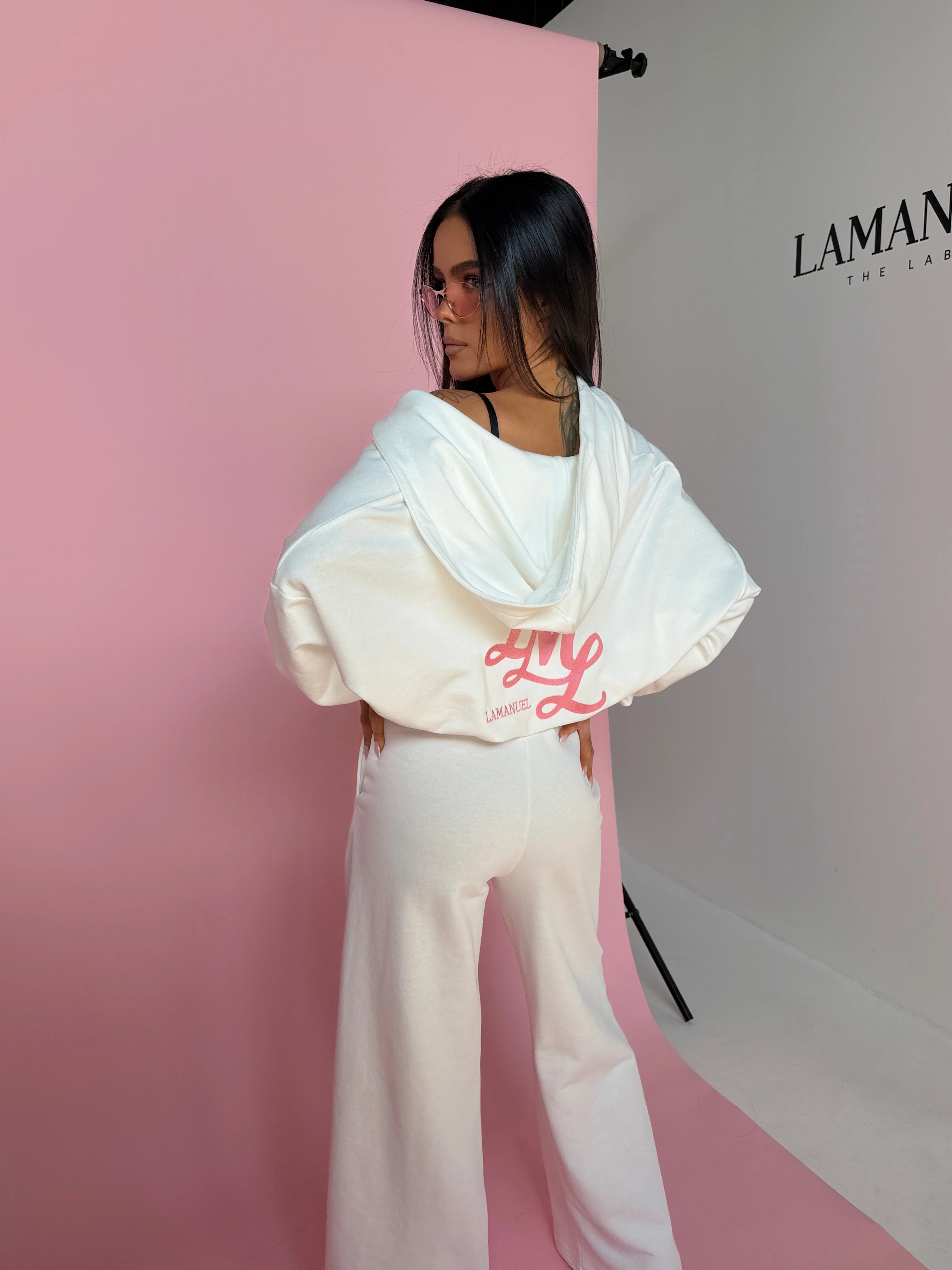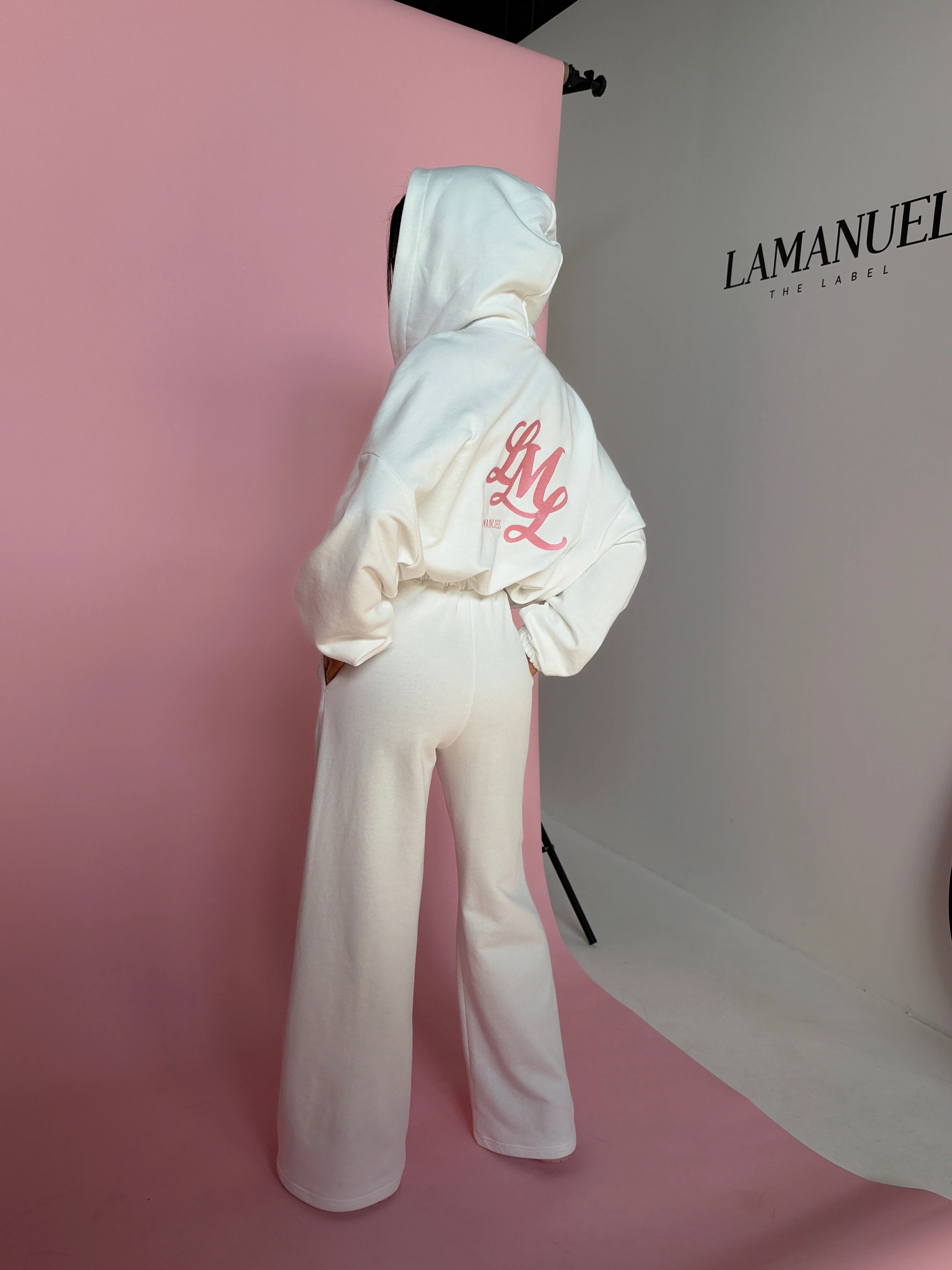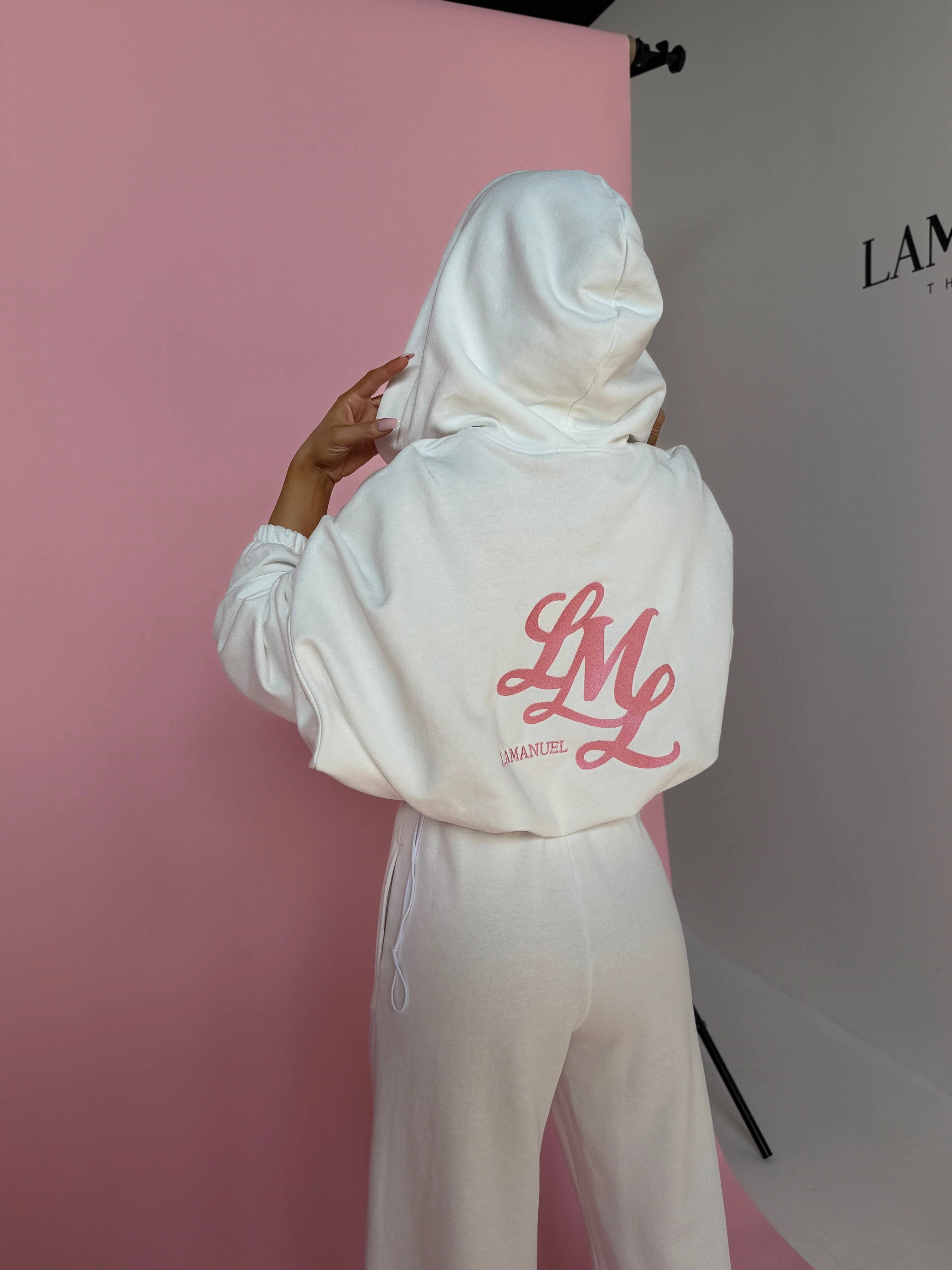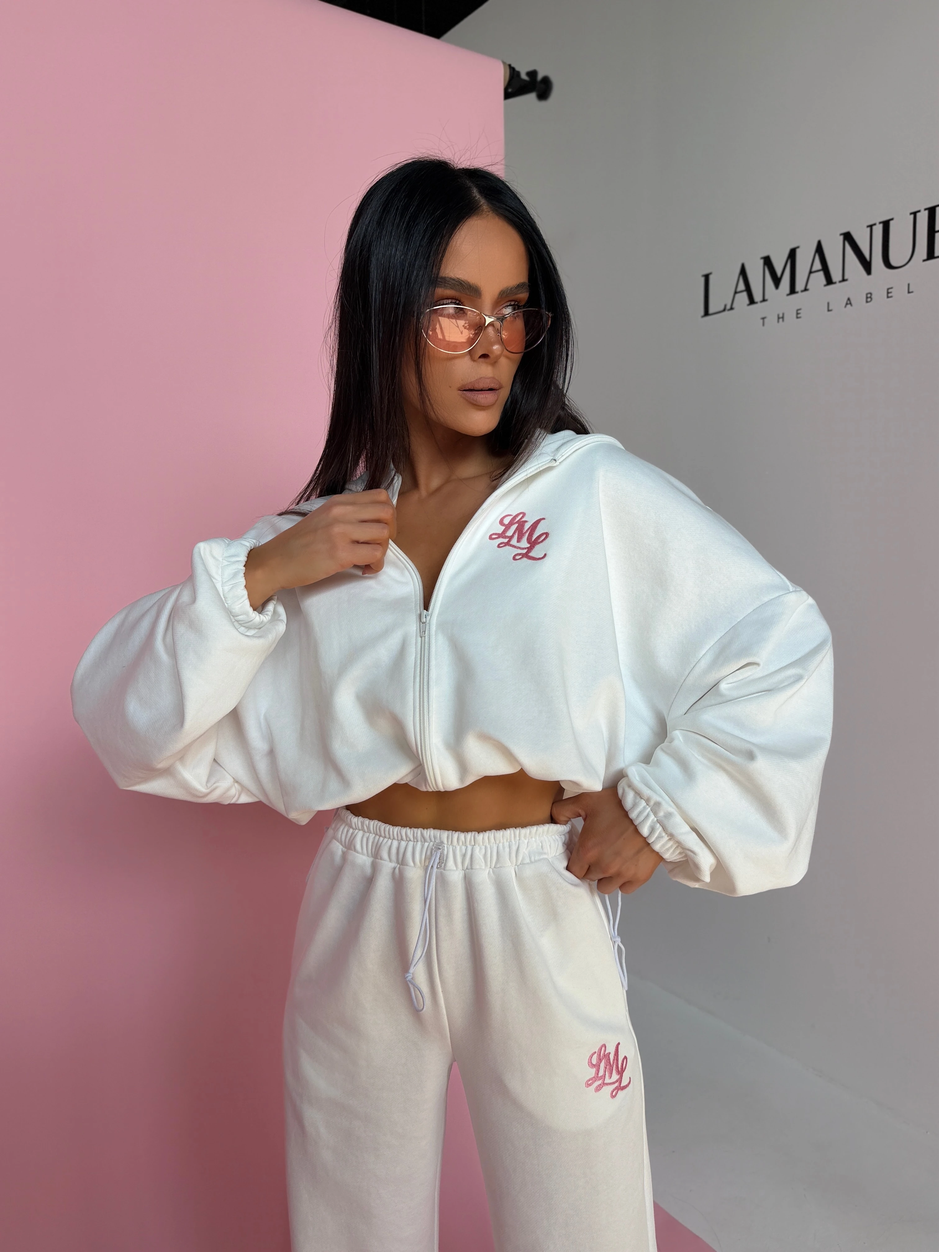Komplet dresowy o luźnym, oversize’owym kroju. Bluza z kapturem zapinana na zamek, z obniżoną linią ramion i regulacją dołu, która pozwala dopasować fason. Spodnie z szeroką nogawką, gumą w pasie i swobodnym krojem, który dobrze układa się na sylwetce. Na przodzie subtelne haftowane logo, na plecach duży, wyrazisty nadruk. Model tworzy spójny, nowoczesny look idealny do codziennych stylizacji i kompletów.