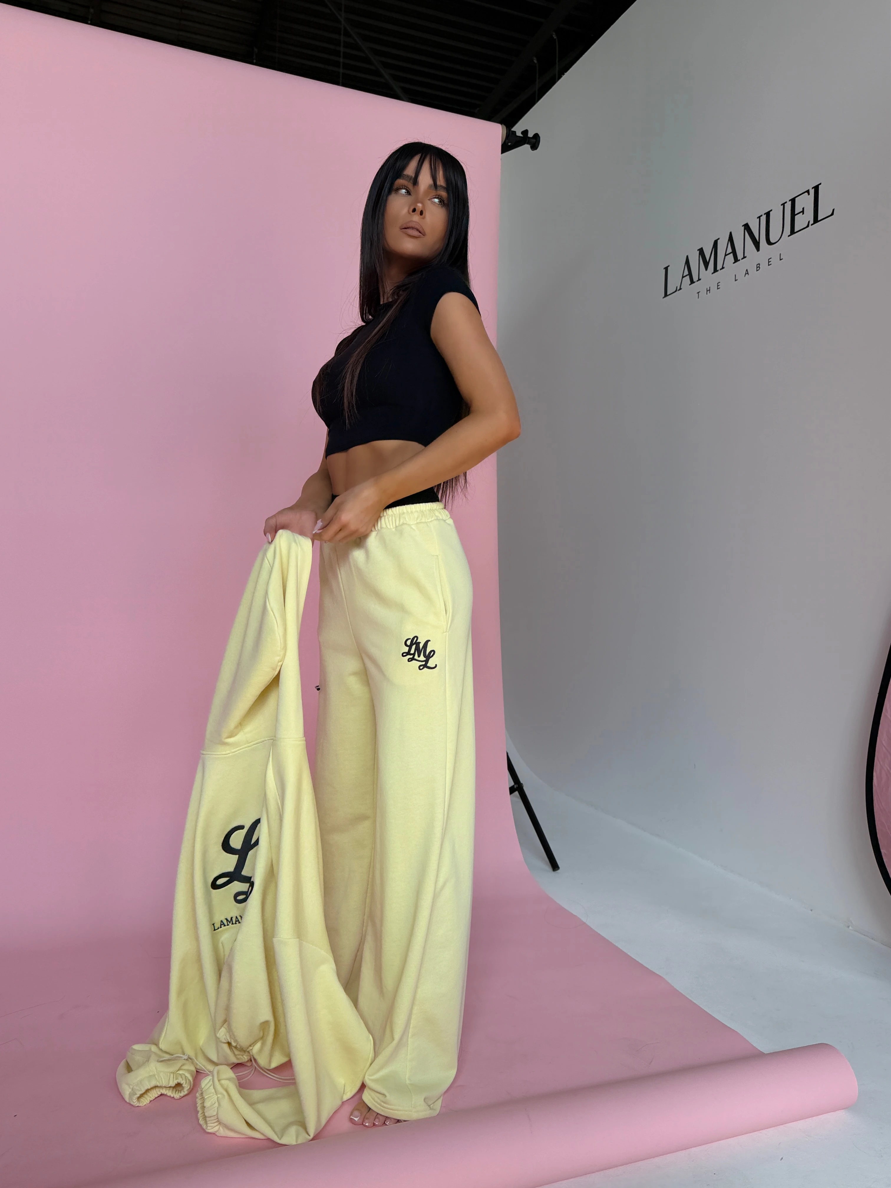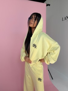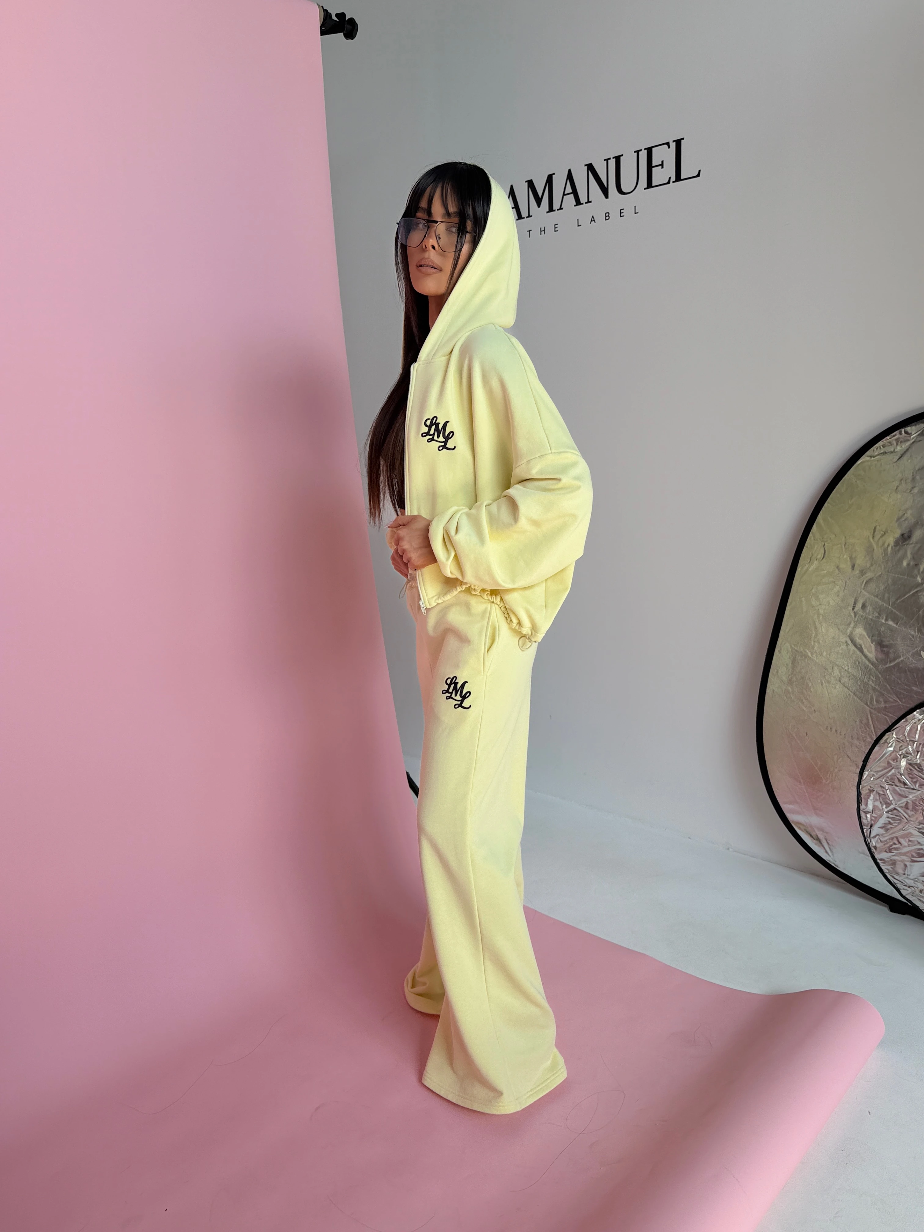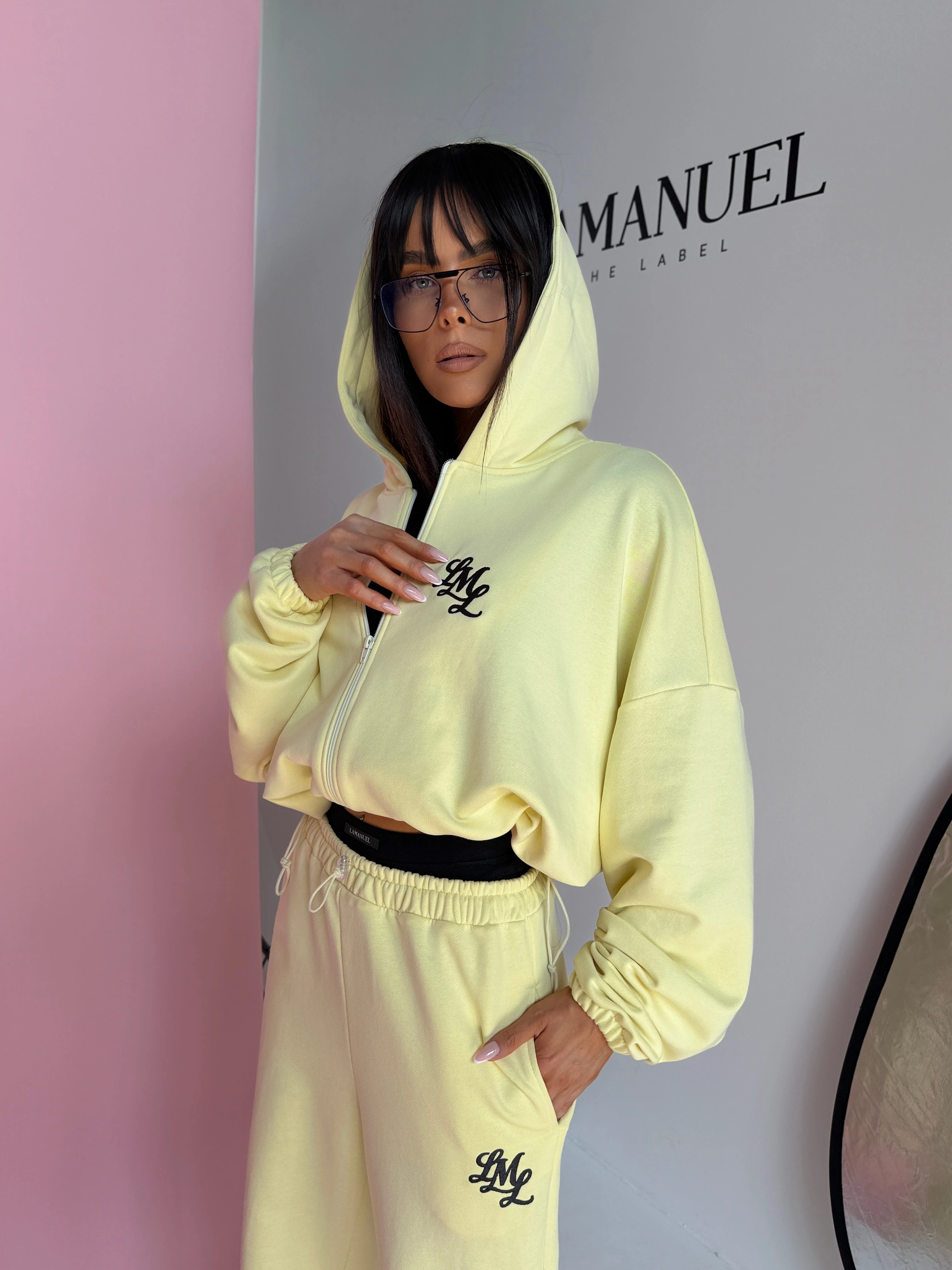 Komplet dresowy o luźnym, oversize’owym kroju. Bluza z kapturem zapinana na zamek, z obniżoną linią ramion i regulacją dołu, która pozwala dopasować fason. Spodnie z szeroką nogawką, gumą w pasie i swobodnym krojem, który dobrze układa się na sylwetce. Na przodzie subtelne haftowane logo, na plecach duży, wyrazisty nadruk. Model tworzy spójny, nowoczesny look idealny do codziennych stylizacji i kompletów.