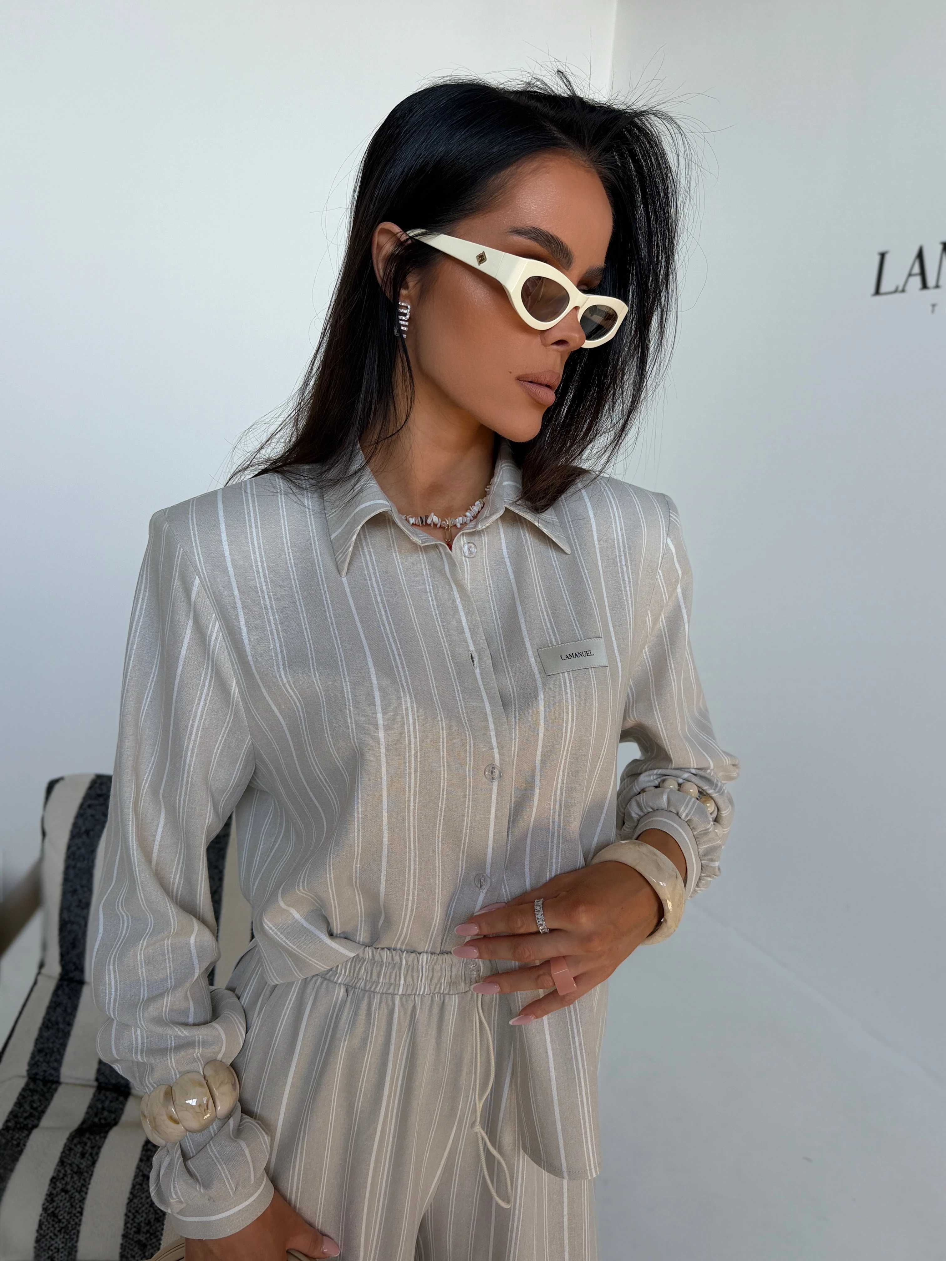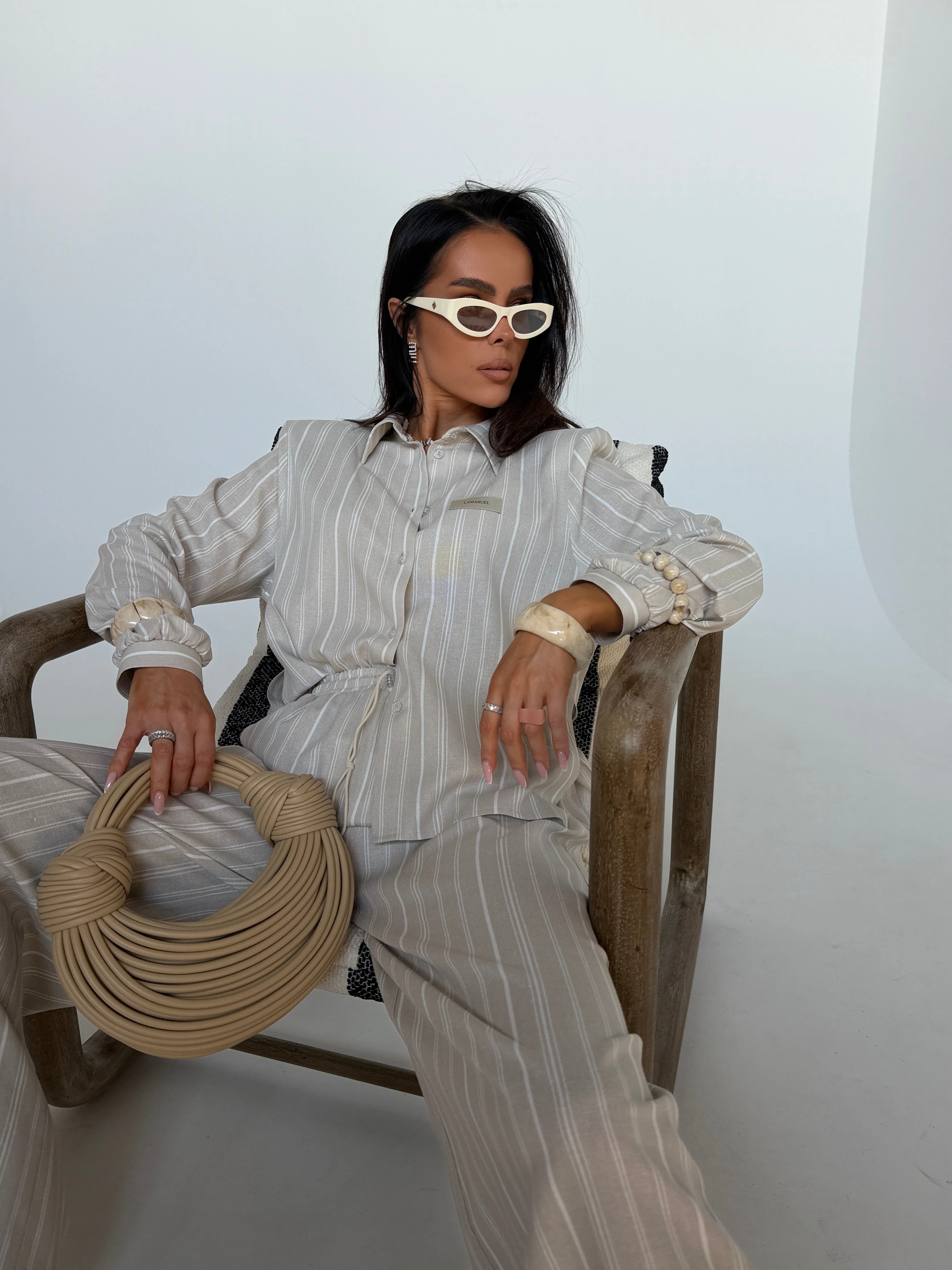 Elegancja w swobodnym wydaniu, która buduje sylwetkę już samą formą. Strukturalna góra z wyraźnie zaznaczoną linią ramion nadaje całości charakteru i pewności siebie. Koszula o dopracowanym kroju idealnie współgra ze spodniami z wysokim stanem, tworząc proporcje, które wydłużają i wysmuklają sylwetkę. Naturalna tkanina na bazie wiskozy, bawełny i lnu zapewnia lekkość oraz komfort noszenia nawet w cieplejsze dni. Subtelny wzór w pionowe pasy dodaje elegancji, a jednocześnie zachowuje nowoczesny, niewymuszony styl. Komplet, który sprawdzi się zarówno w codziennym ruchu, jak i w bardziej dopracowanych stylizacjach. Skład: 60% wiskoza 25% bawełna 15% len
