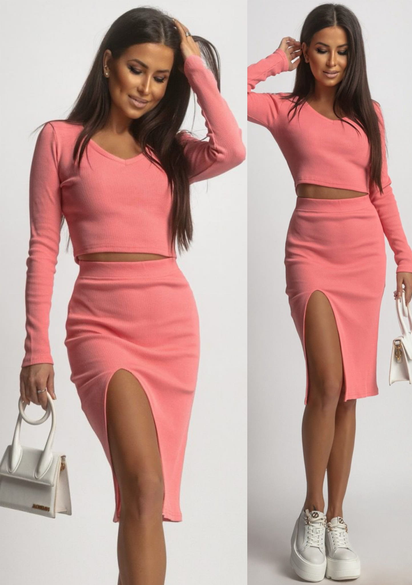 Dzianinowy komplet w prążkowany składa się z crop topu z długim rękawem i spódnicy ołówkowej z wycięciem. W pasie spódnica ma szeroką gumę.