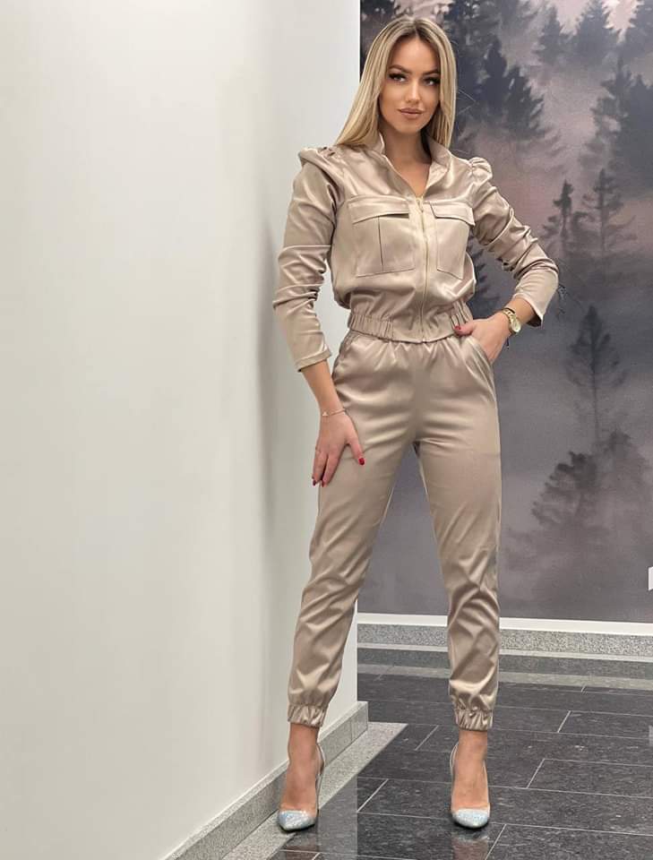 Komplet satynowy Bluza + Spodnie Beżowy