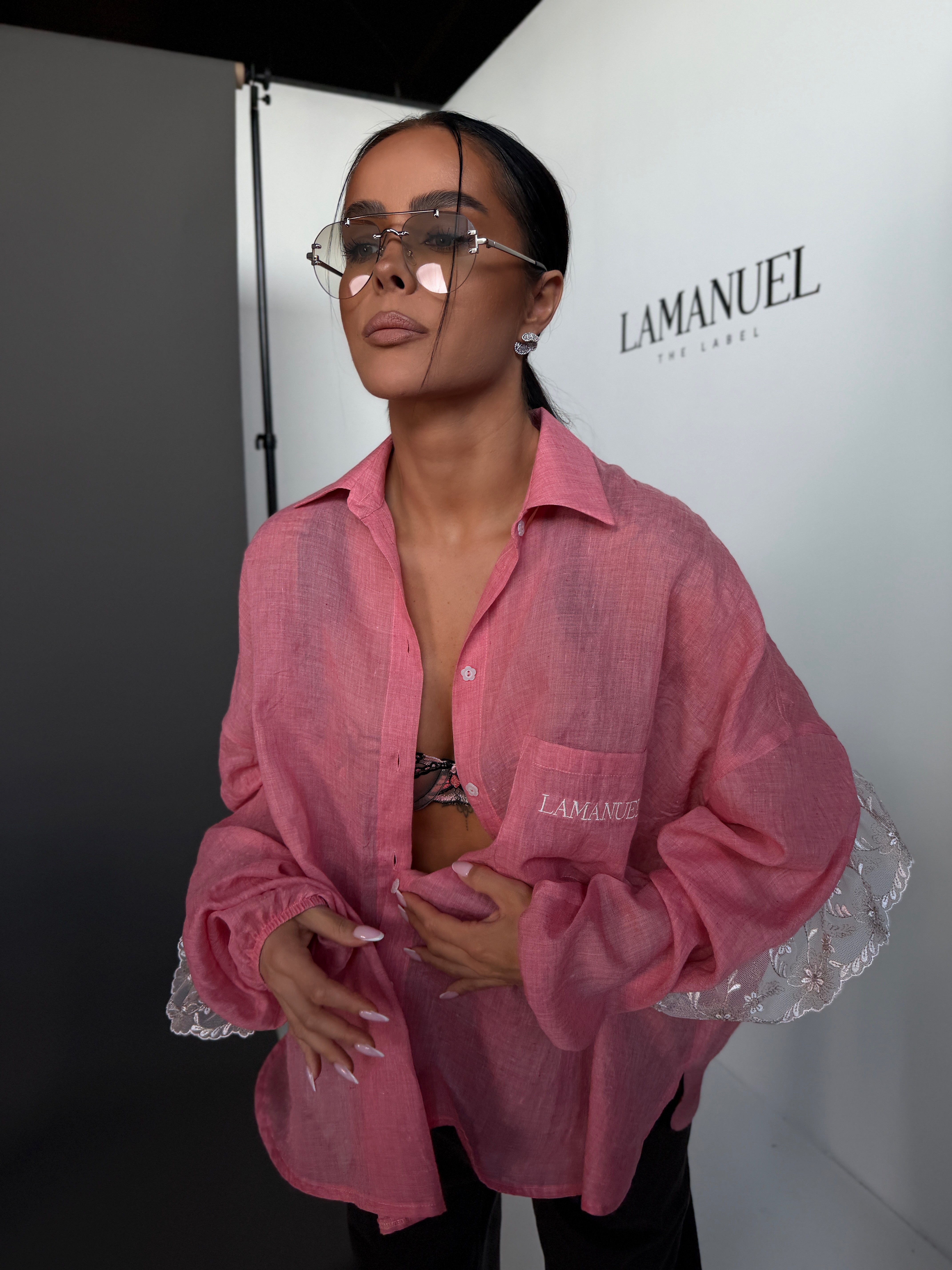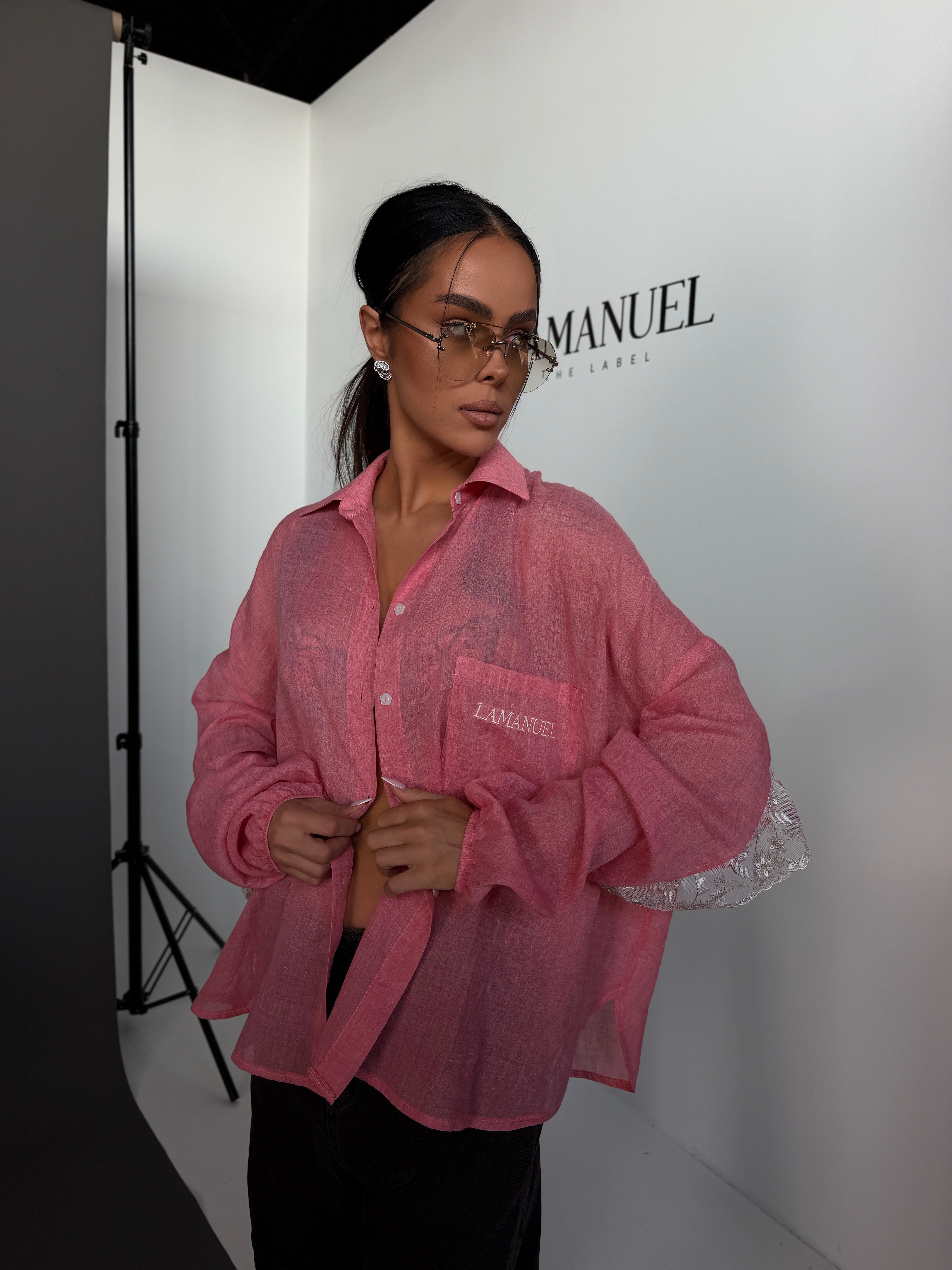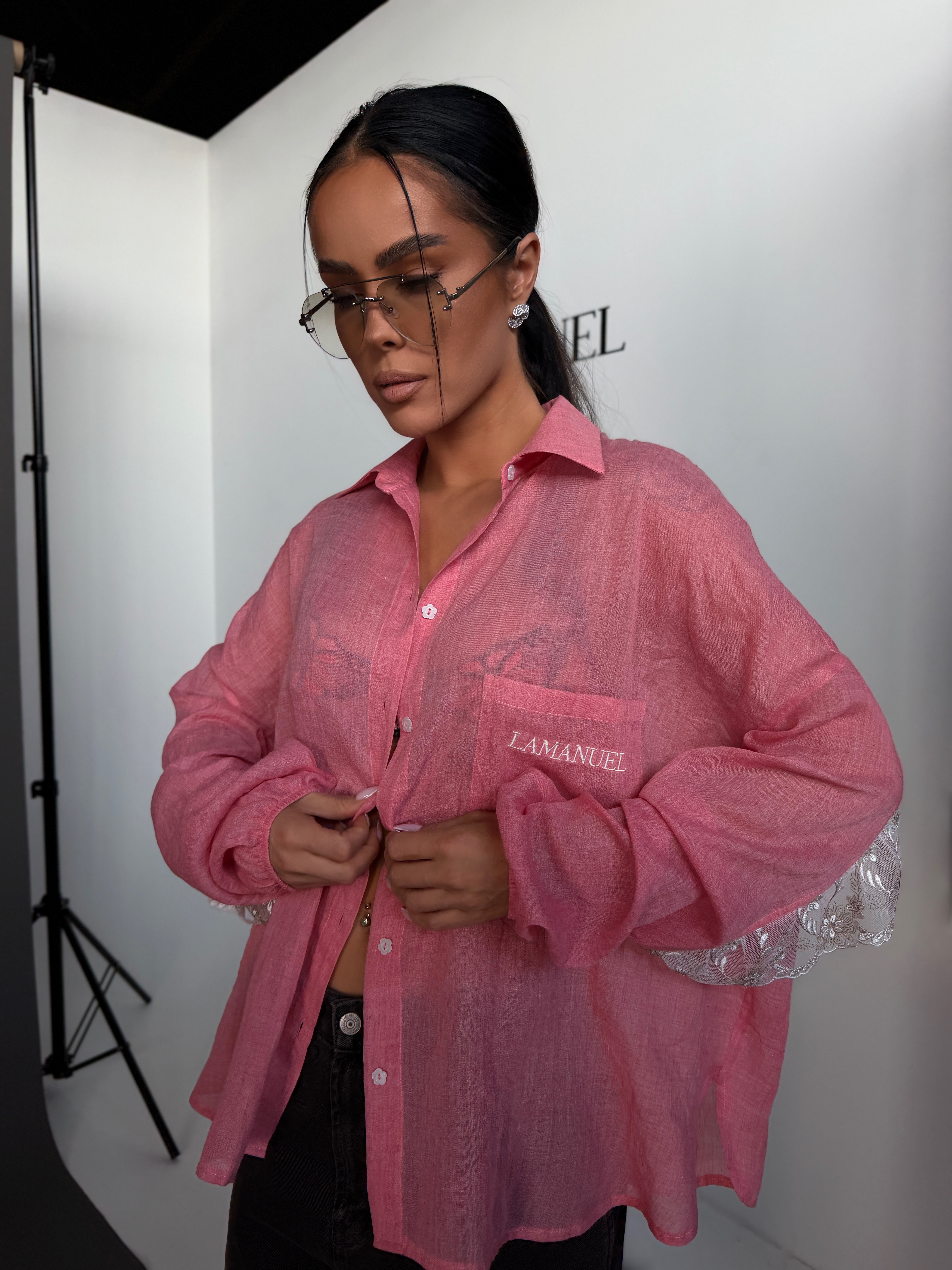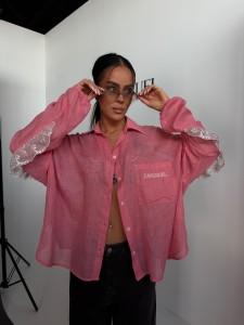 Koszula o lekkiej, oversize’owej formie, wykonana z przewiewnej, półtransparentnej tkaniny, która nadaje jej delikatnego, kobiecego charakteru. Klasyczny kołnierzyk i zapięcie na guziki przełamane są ozdobnym wykończeniem z koronką na plecach i rękawach, co tworzy efektowny detal i wyróżnia model. Luźny krój zapewnia swobodę noszenia i naturalnie układa się na sylwetce, tworząc nowoczesny, lekki look.