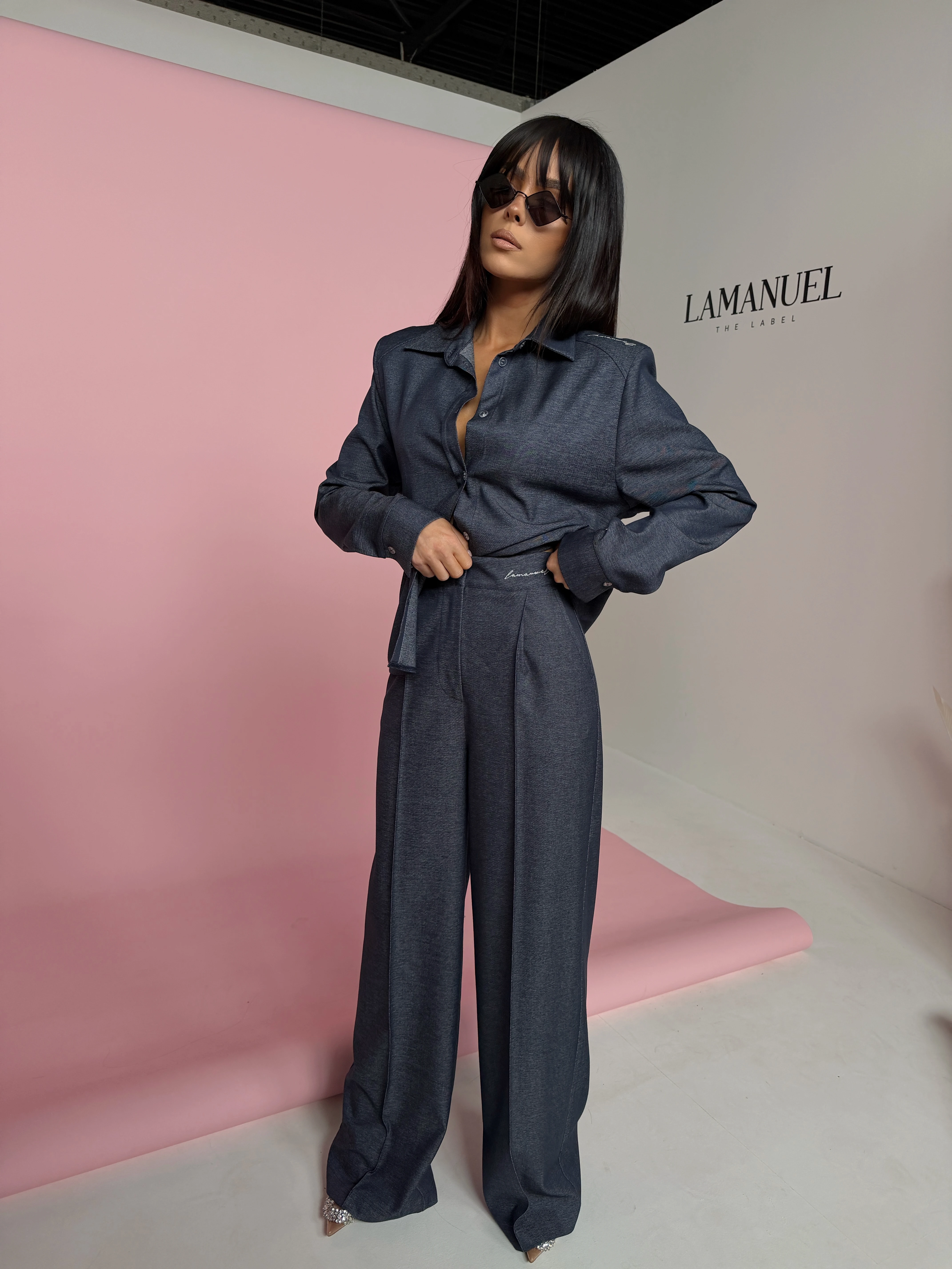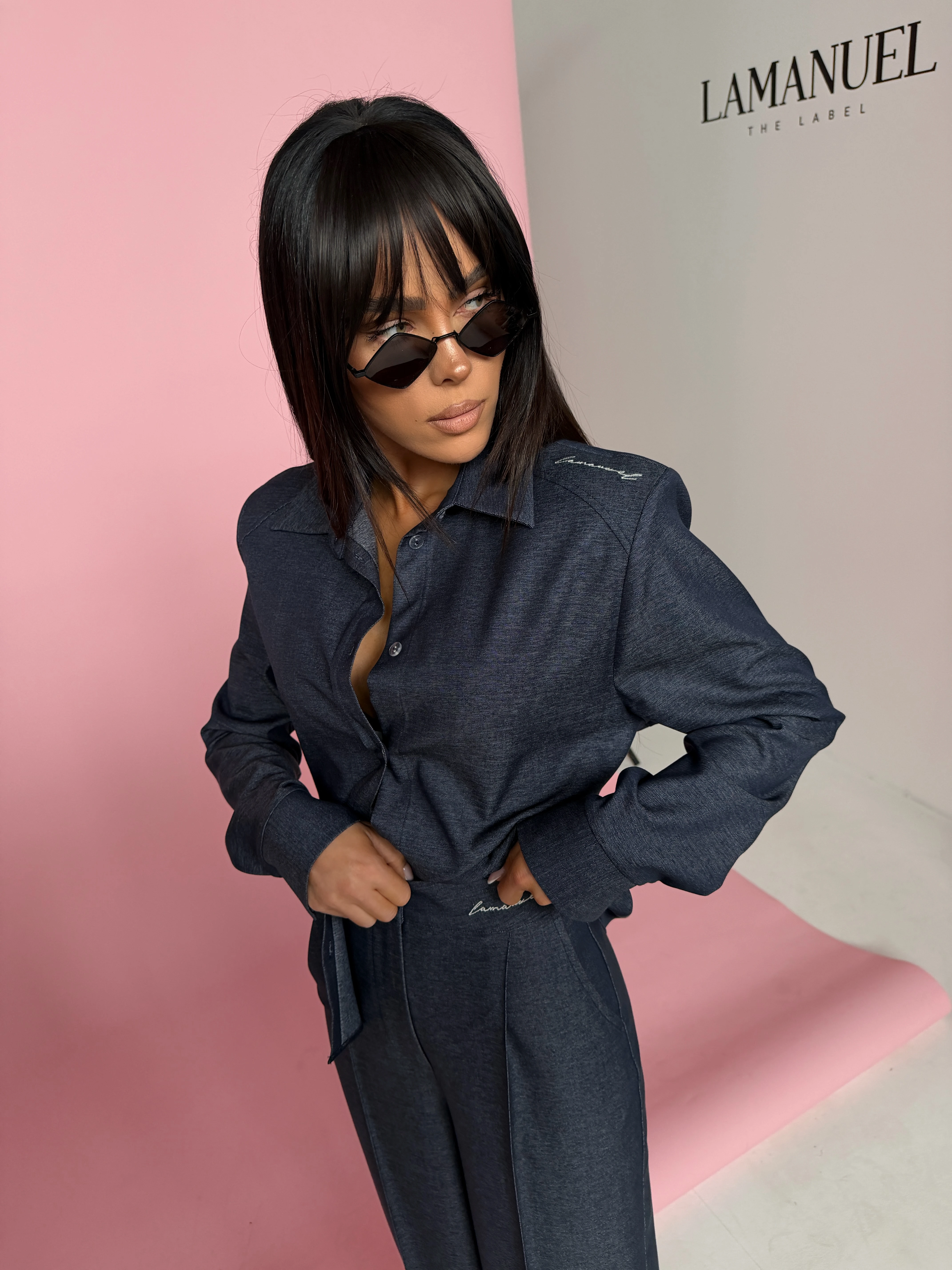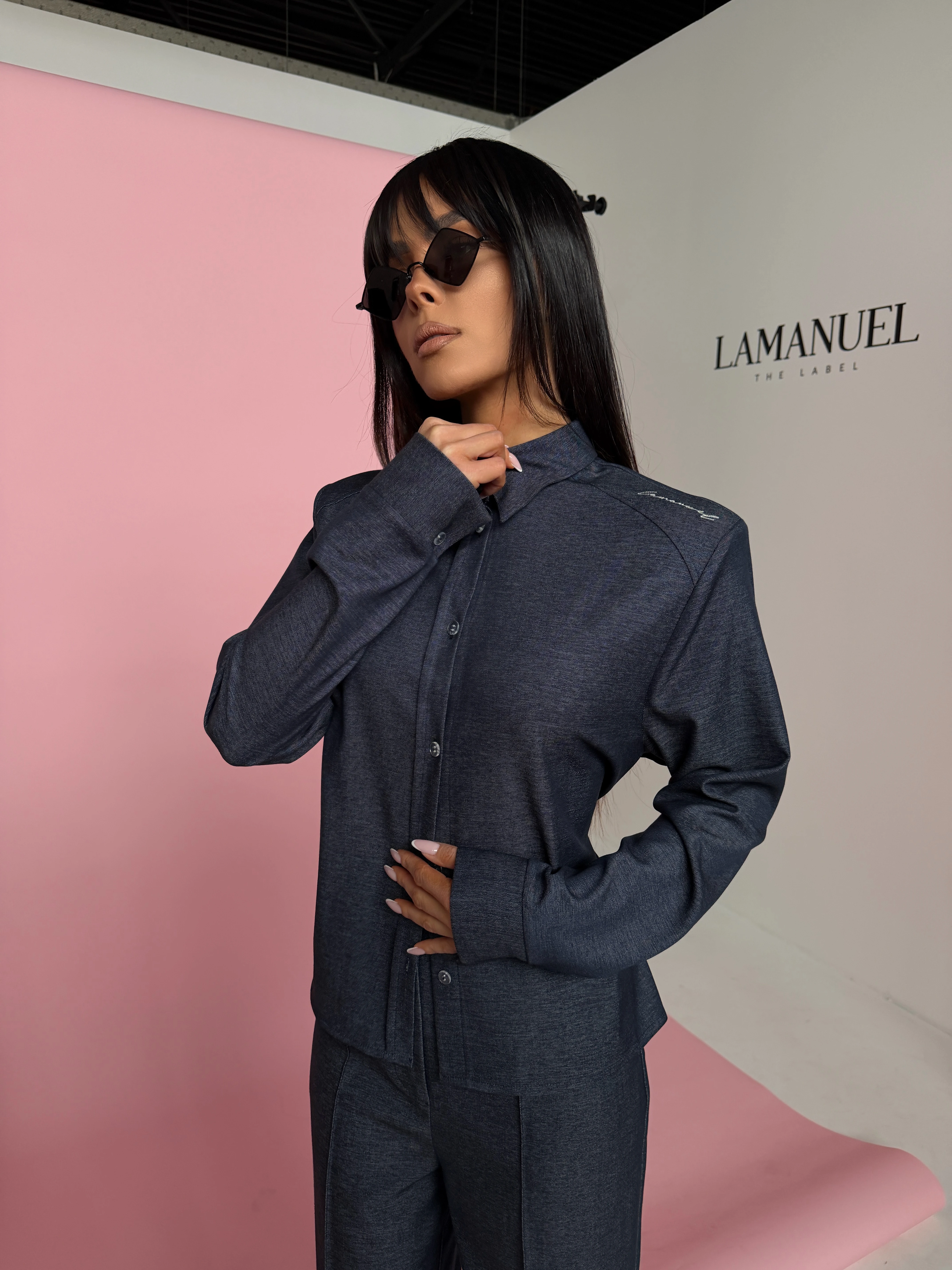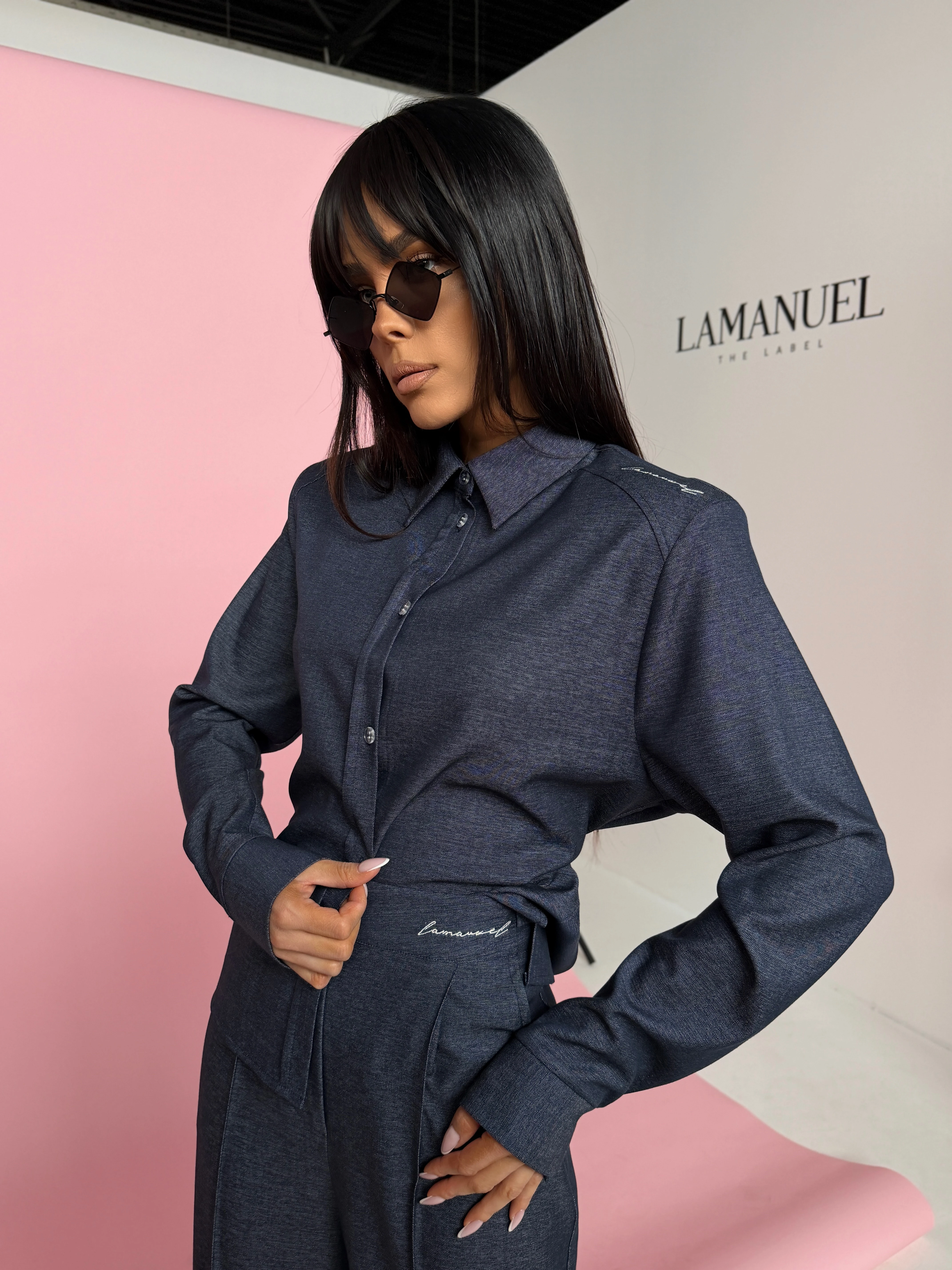 Koszula o dopasowanym kroju z poduchami na ramionach, wykonana z elastycznego materiału zapewniającego komfort noszenia. Model zapinany na guziki, z klasycznym kołnierzykiem i długim rękawem. W talii wiązanie podkreślające sylwetkę. Subtelne haftowane logo na ramieniu dodaje charakteru. Elegancki fason idealny do stylizacji codziennych i bardziej formalnych. Skład: 70% poliester 28% rayon 2% spandex