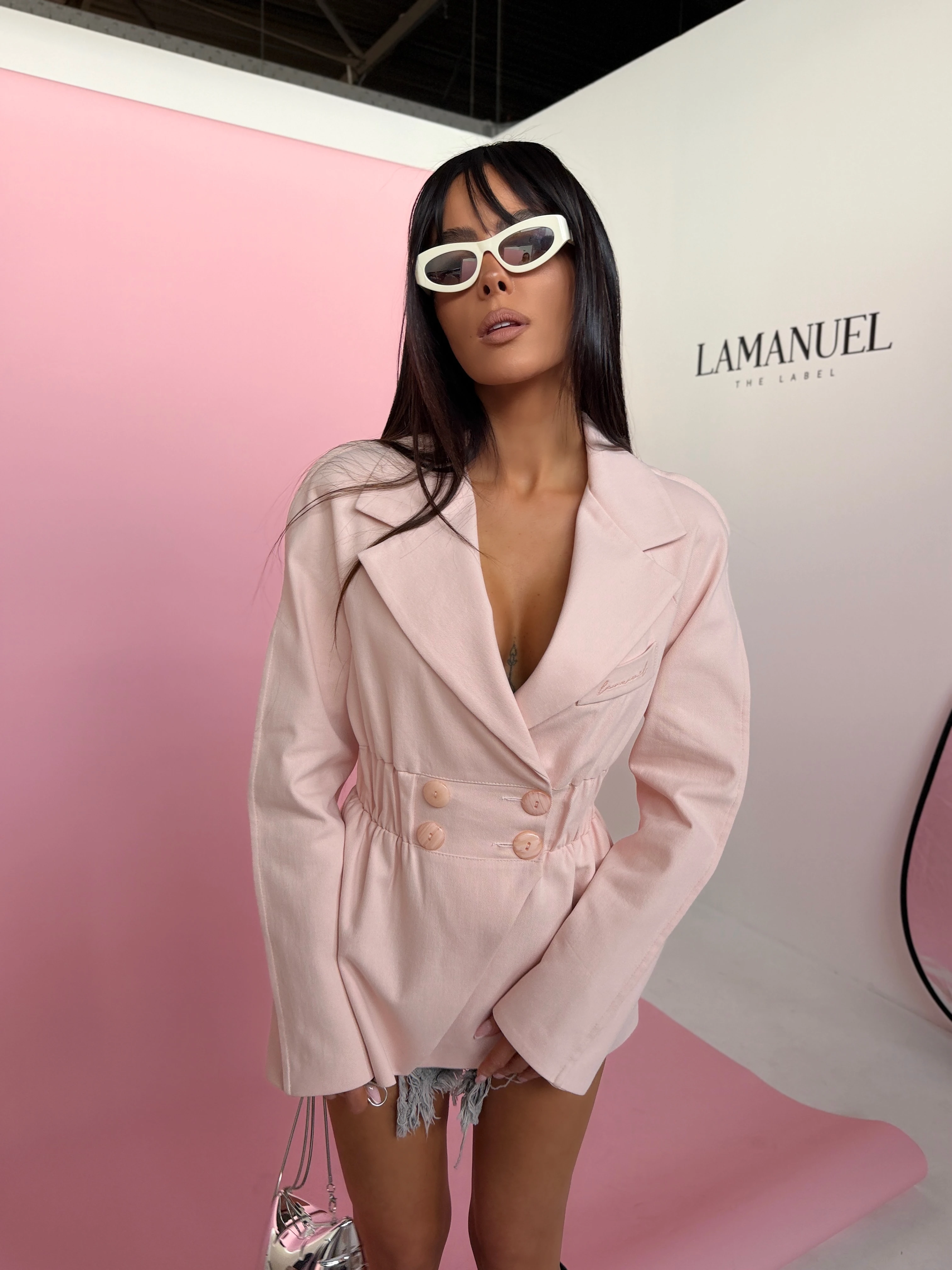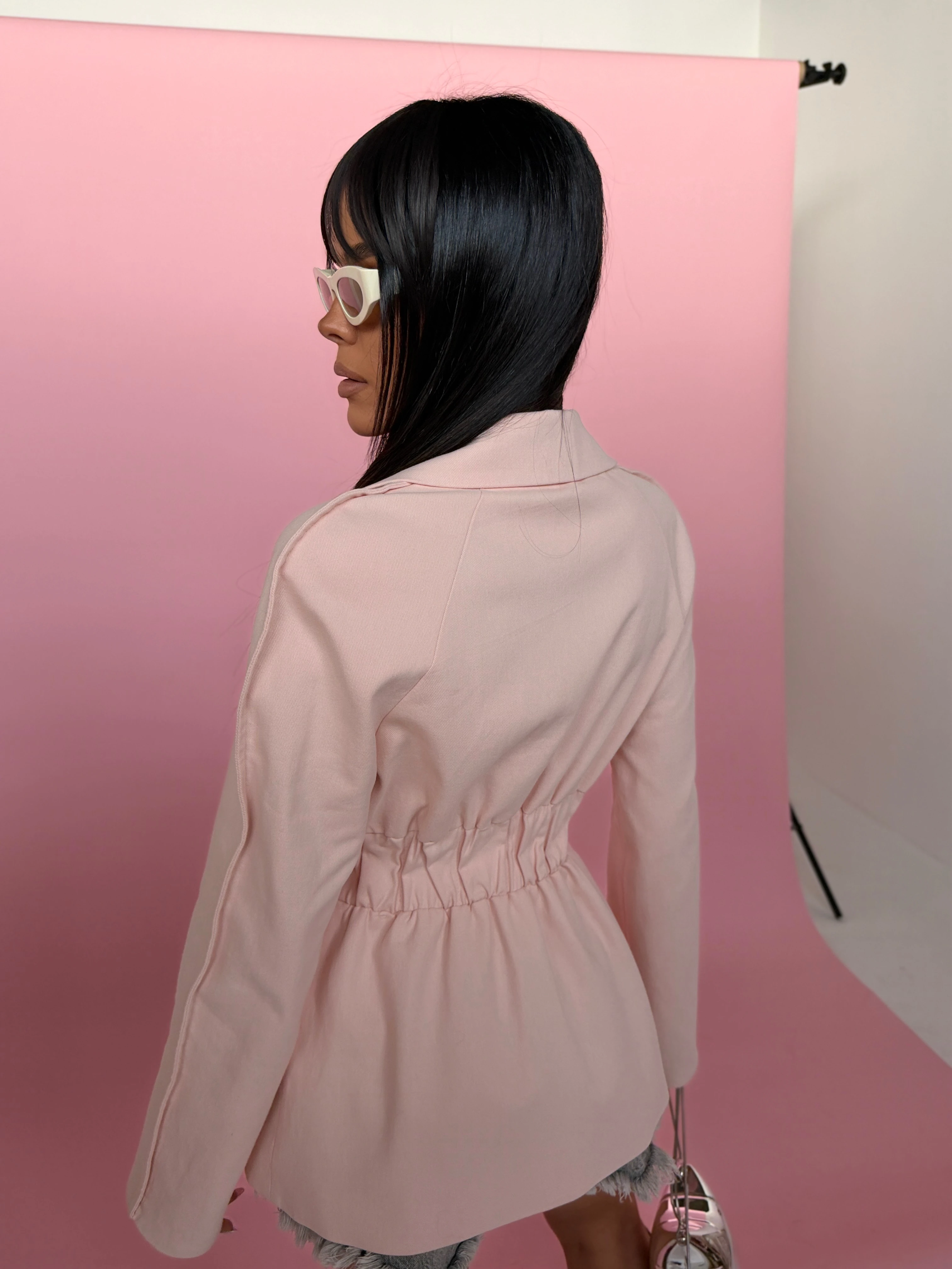 Marynarka o dopracowanym kroju, wykonana z denimu. Model dwurzędowy, zapinany na guziki, z wyraźnie zaznaczoną talią dzięki marszczeniu. Klasyczne klapy i lekko wydłużona linia nadają eleganckiego charakteru, przełamanego casualowym materiałem. Nowoczesna forma, która łączy styl i wygodę w jednej sylwetce.