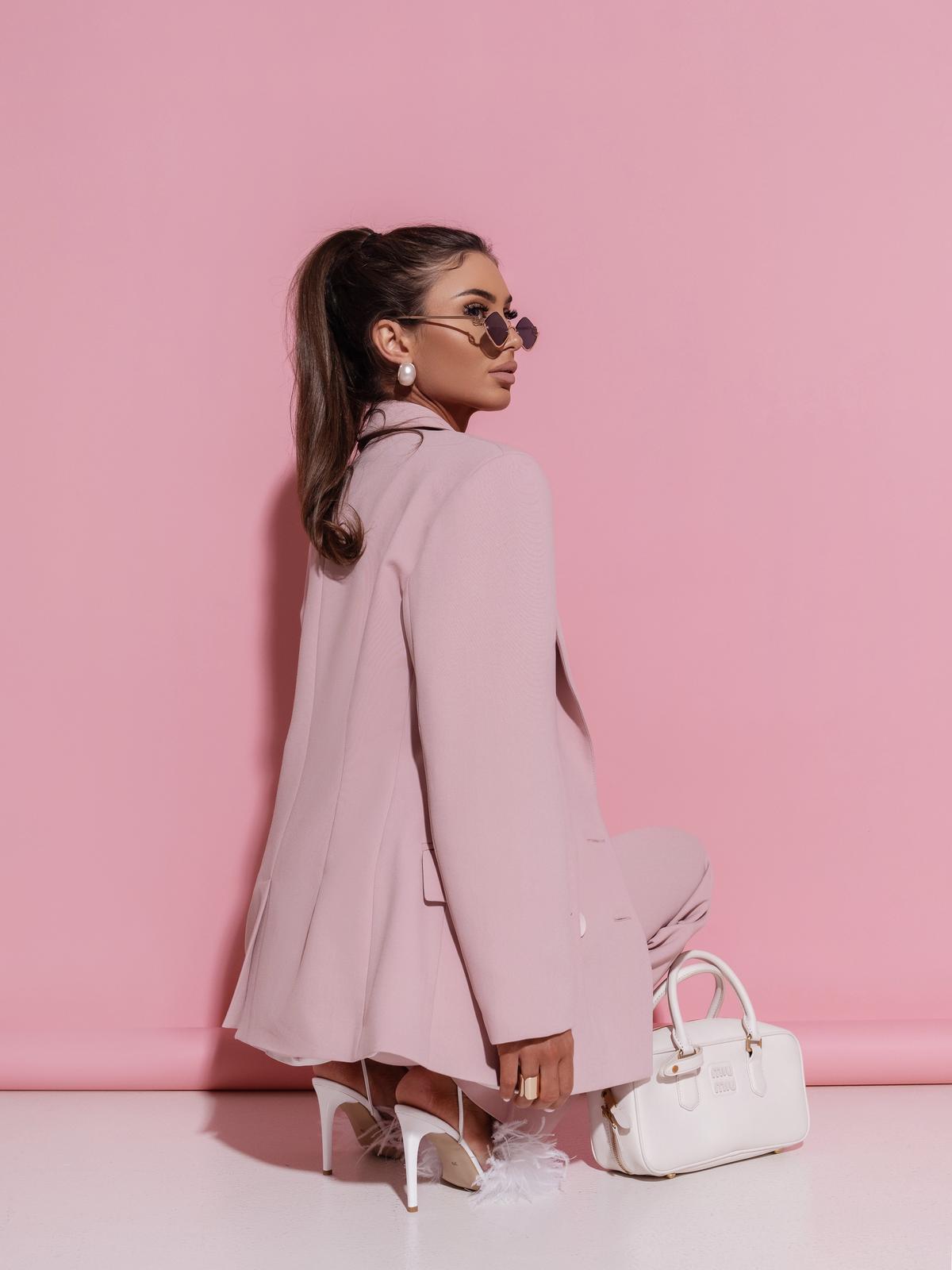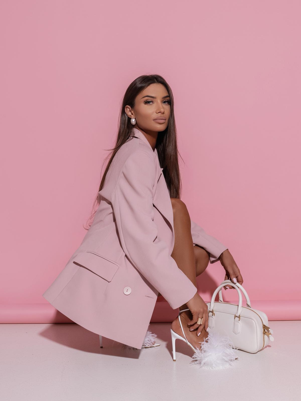 Model o klasycznym kroju z podkreśloną linią ramion oraz dwurzędowym zapięciem na guziki dodaje szyku i nowoczesnej elegancji. Delikatny odcień pudrowego różu nadaje całości subtelnego, kobiecego charakteru.