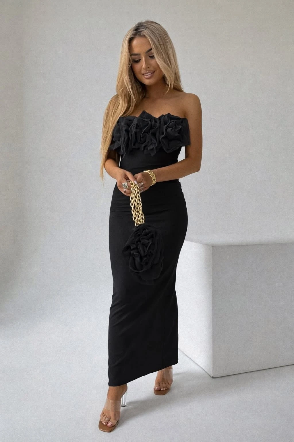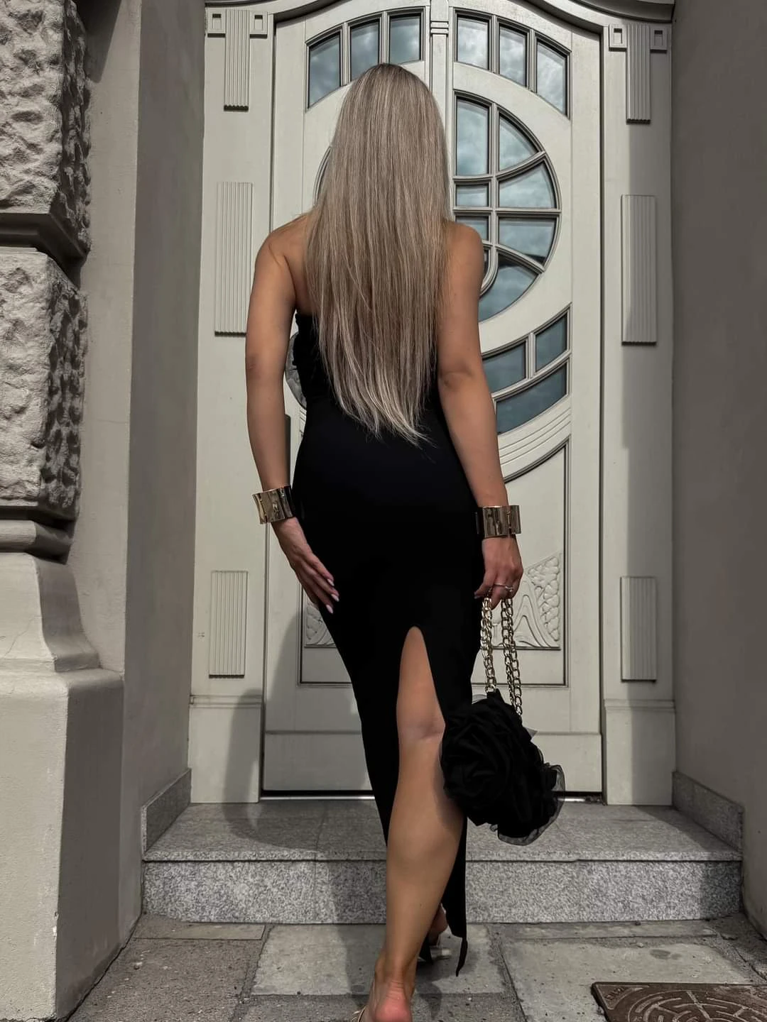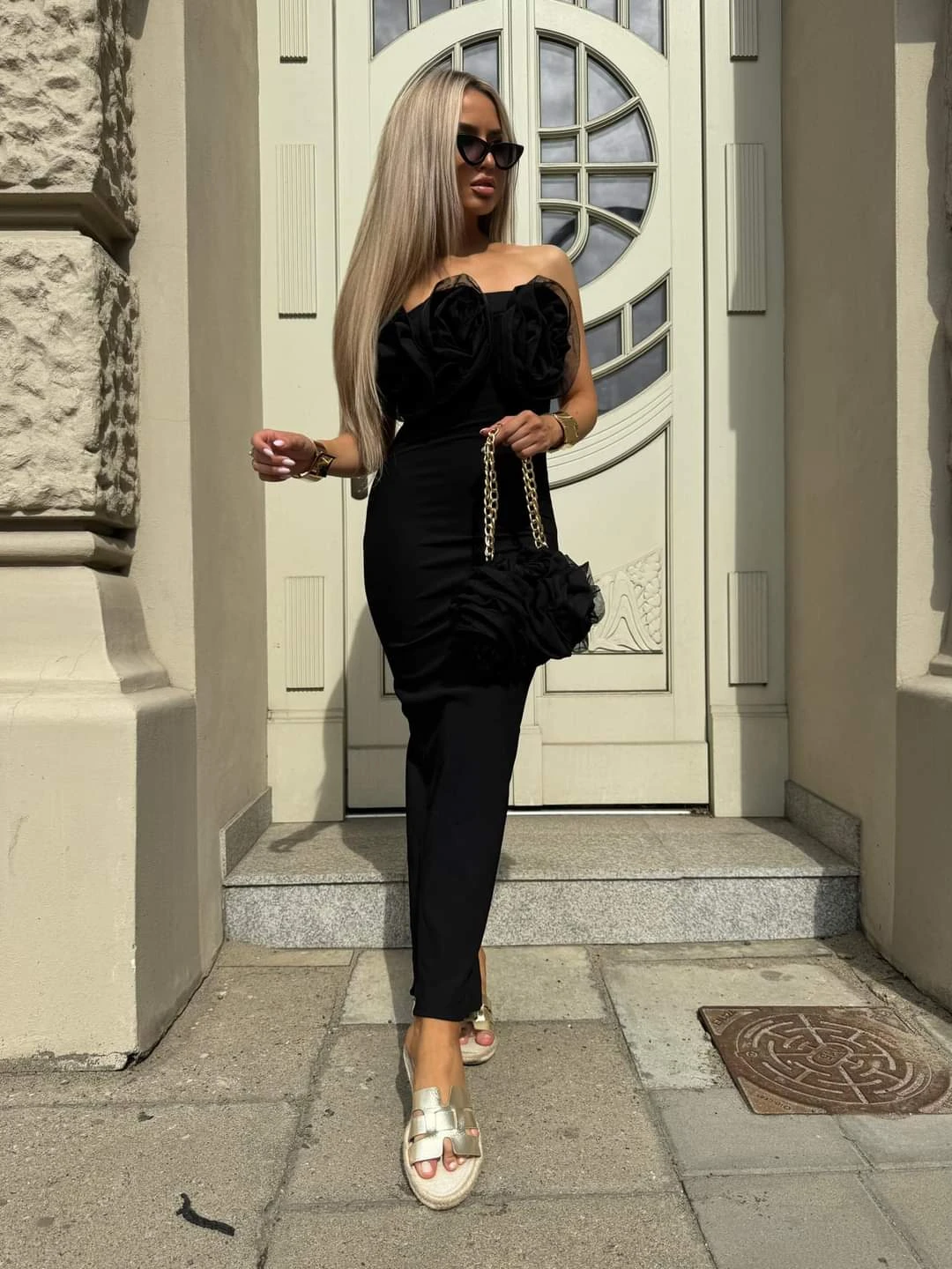 W zestawie znajduje się przepiękna wizytowa torebka wykonana z tego samego materiału co sukienka. Torebka posiada grubsze, złote łańcuszki oraz dwie róże stanowiące idealny komplet z sukienką.