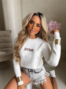 Sweter o dopasowanym kroju z długimi rękawami. Na środku klatki piersiowej umieszczony subtelny napis „BYME”, który nadaje całości minimalistyczny charakter. Model posiada klasyczny, okrągły dekolt.