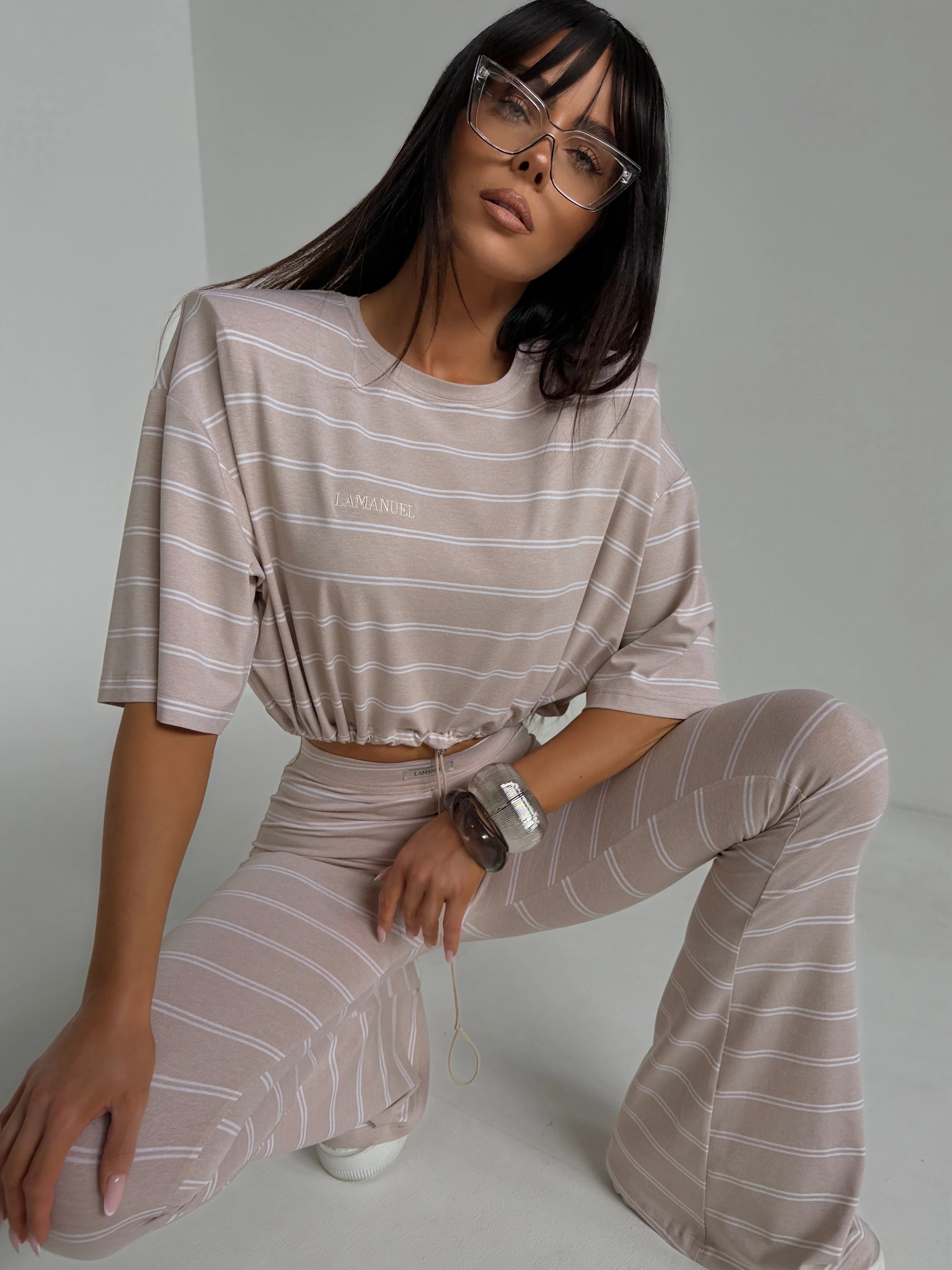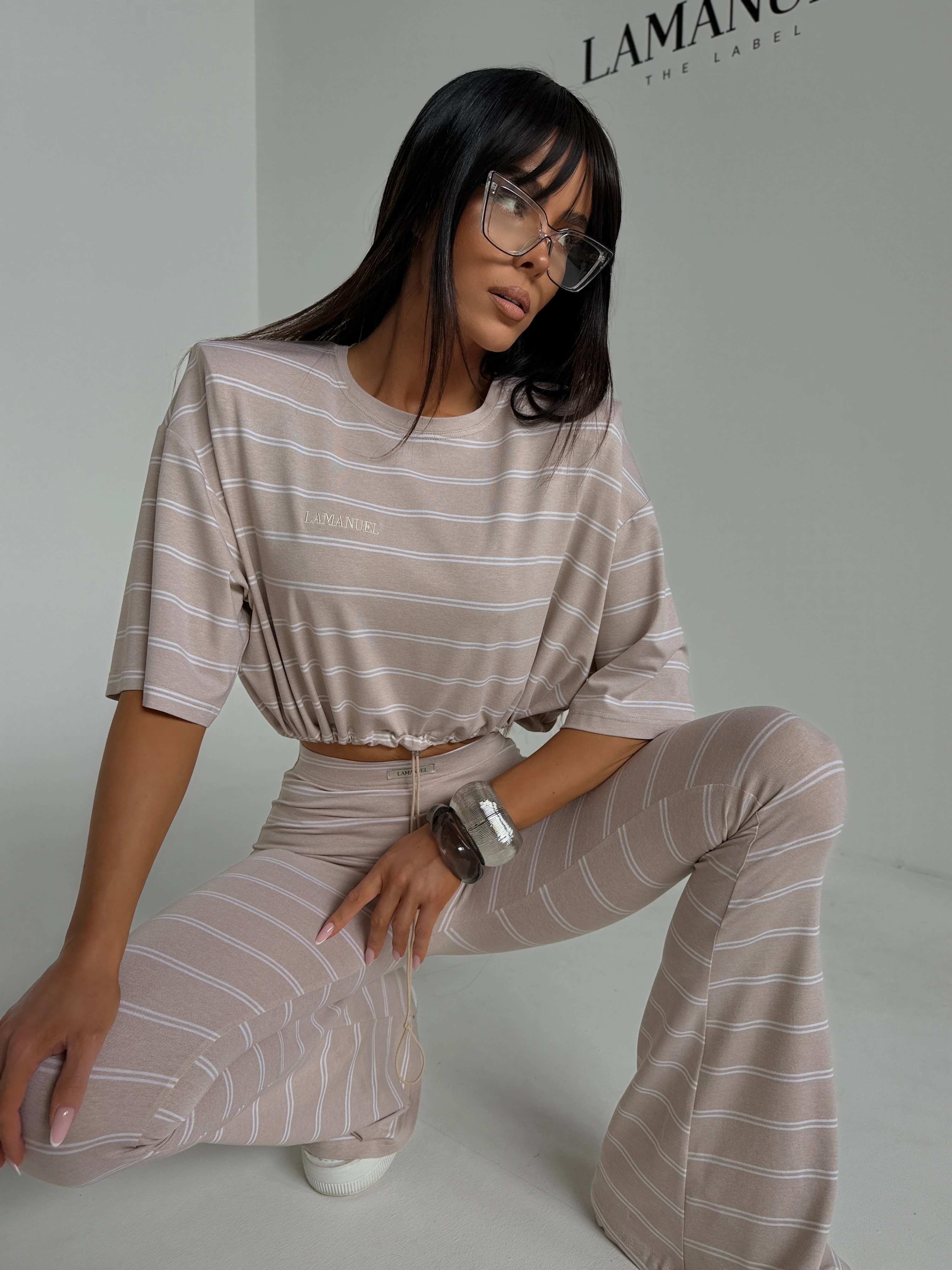 Krótki t-shirt z efektem podciągnięcia dzięki regulowanemu wiązaniu na dole. Swobodna góra kontrastuje z dopasowaniem w talii, co nadaje sylwetce lekkości. Szeroki rękaw i minimalistyczny krój podkreślają nowoczesny charakter, a delikatne logo i paski budują wyrazisty, codzienny styl.