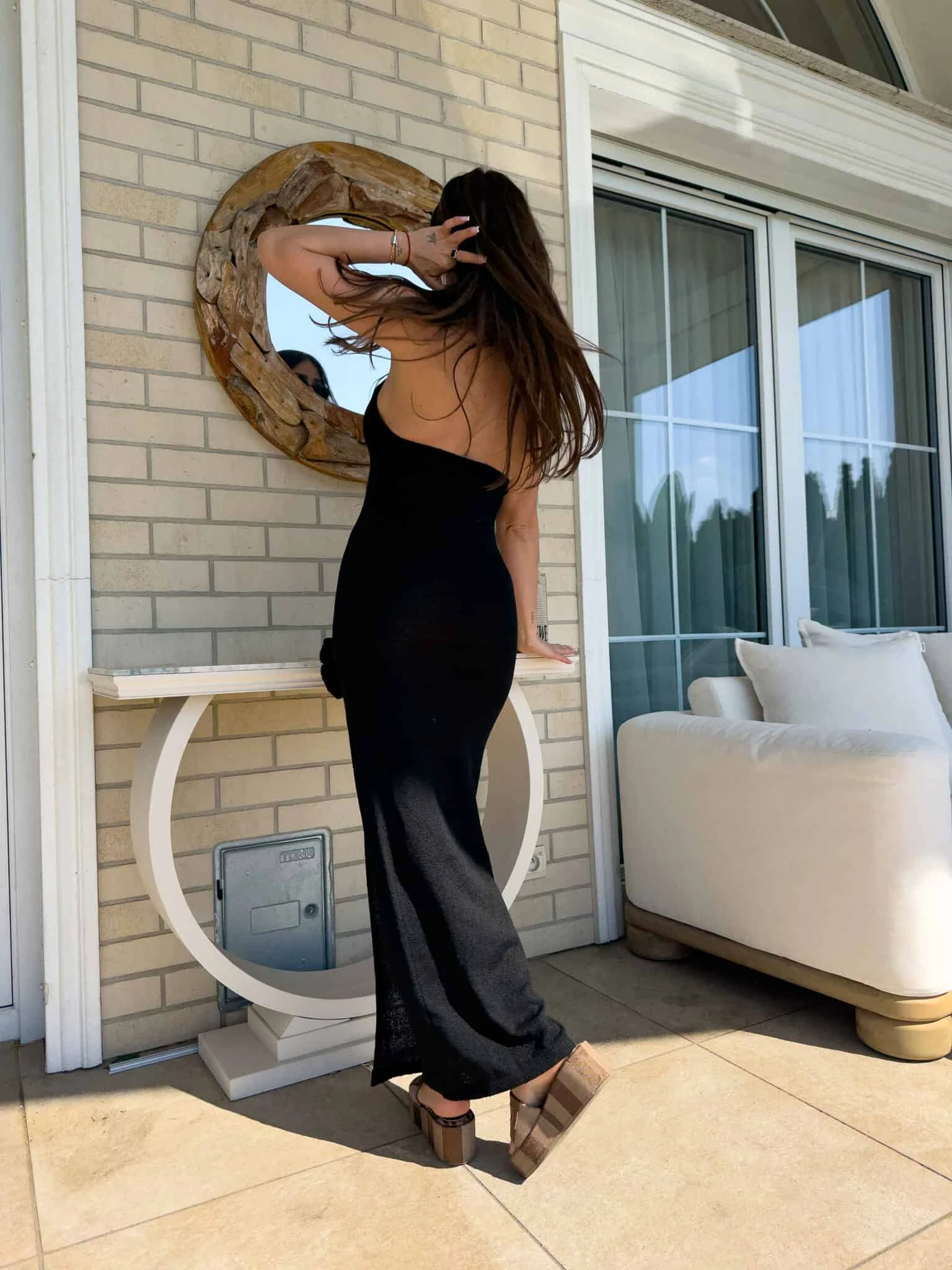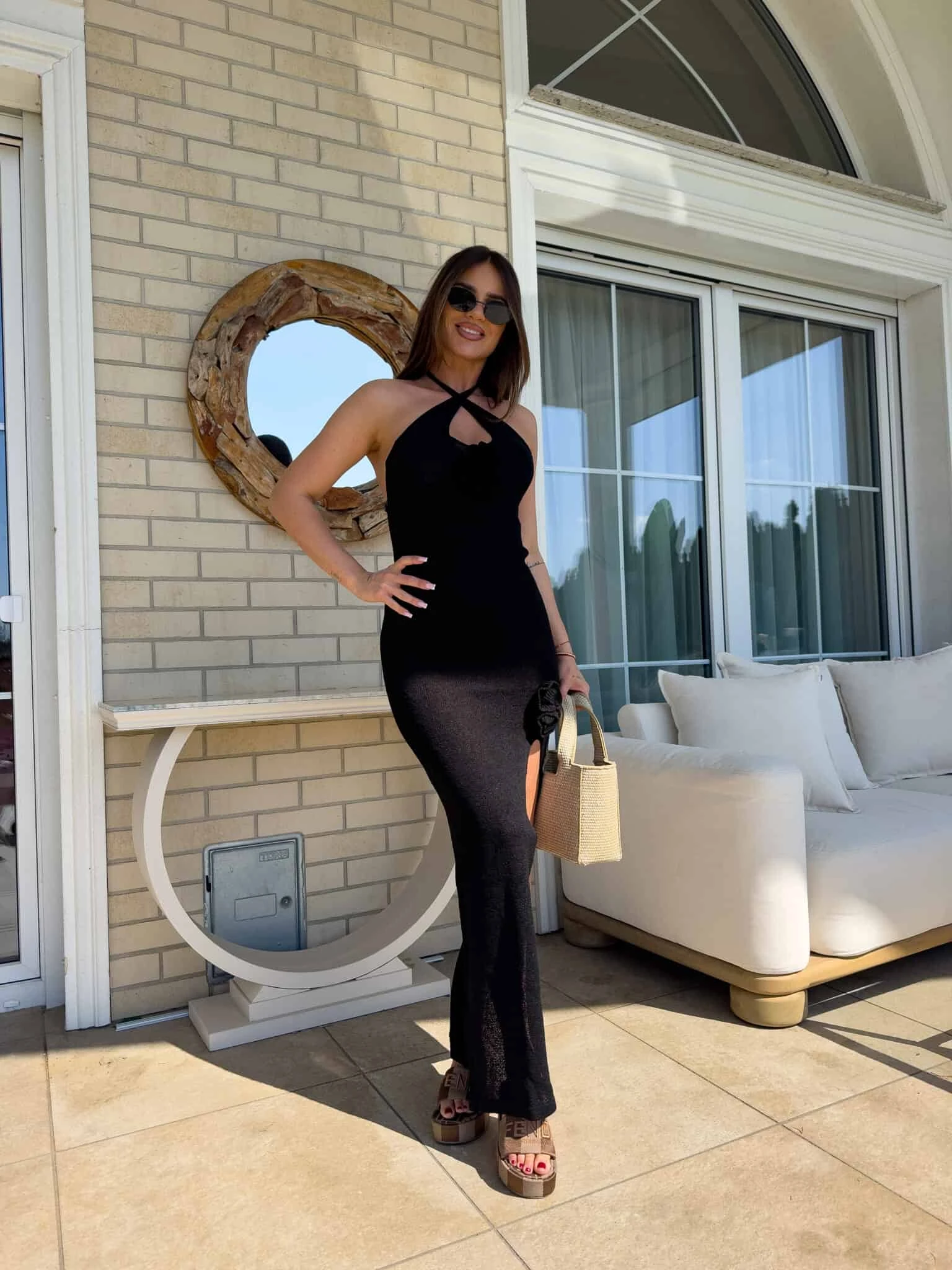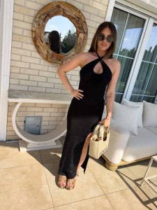 Dopasowana sukienka, wykonana z miękkiej, dzianinowej tkaniny o długości maxi z efektownym rozcięciem na udzie, które dodaje jej lekkości. Góra ma fason halter – wiązana na szyi, z odkrytymi plecami, co nadaje jej letni, zmysłowy wygląd. Na przodzie znajduje się ozdobna aplikacja w kształcie kwiatu na wysokości biustu, a druga – przy rozcięciu na biodrze, co spójnie łączy design całości.